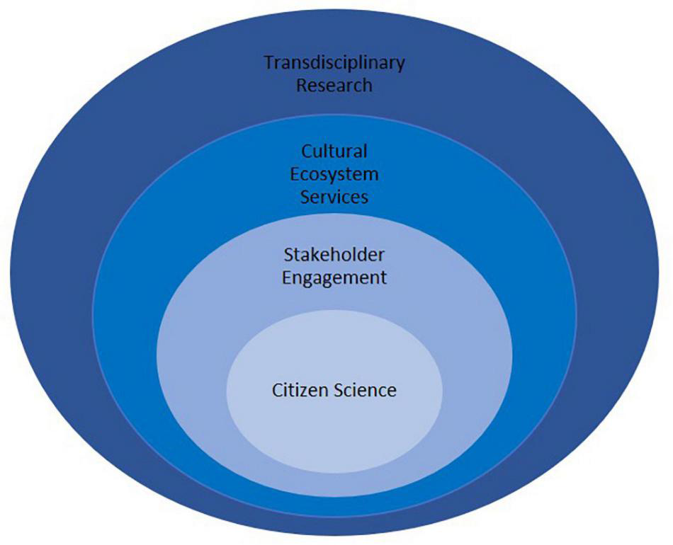 Figure 1. Graphical representation of nested relationship between citizen science, stakeholder engagement, cultural ecosystem services, and transdisiplinary research.