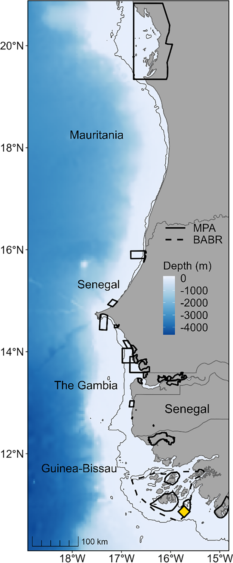 Map of West Africa from the north of Guinea in the south to Mauritania in the north. Solid black polygons show the limits of existing marine protected areas (MPAs). Dashed black line shows the limit of the UNESCO Bolama-Bijagós Archipelago Biosphere Reserve. Yellow diamond indicates the main nesting site of the study population of green turtles (Chelonia mydas); Poilão Island. The bathymetry is shown in a scale of blue, and a thin grey line is the 15 m depth contour.
