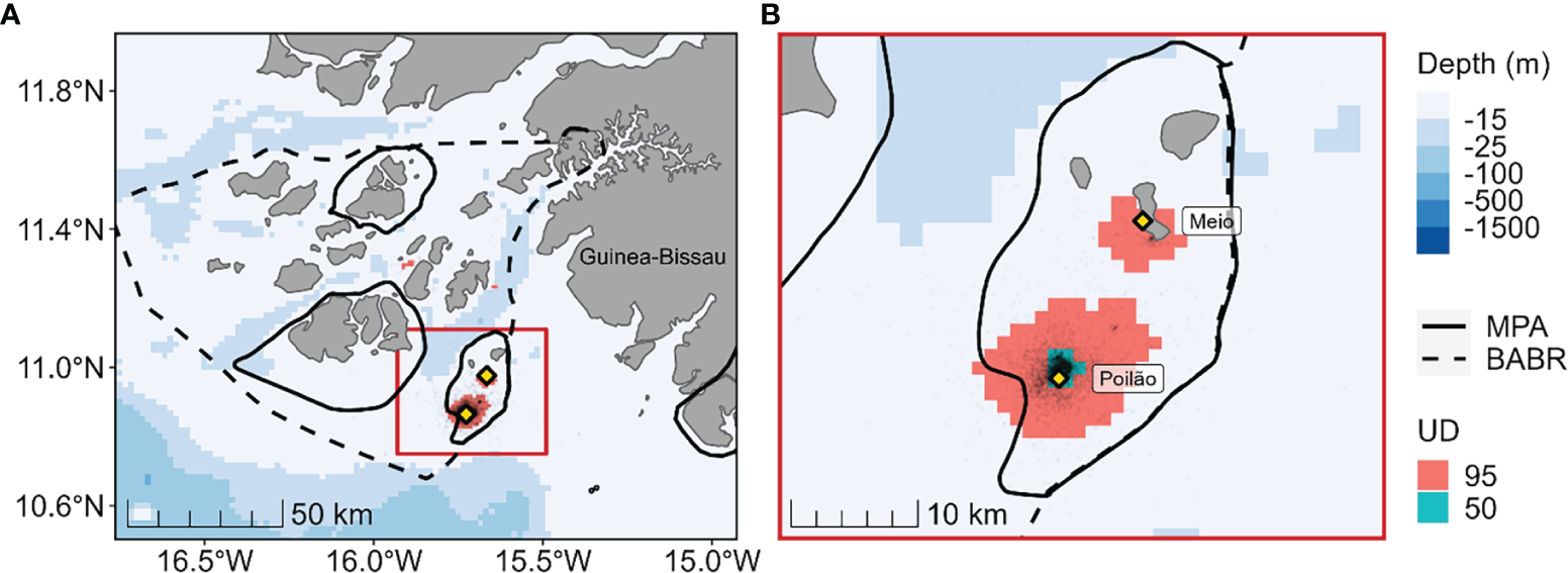 (A) Distribution of 40 female green turtles (Chelonia mydas) tracked during internesting. Yellow diamonds indicate the nesting sites where satellite tags were deployed. The 95% (red) and 50% (blue-green) utilization distribution areas are shown, respectively signifying the population-level home range and core-use areas during internesting. The bold solid lines show the limits of existing marine protected areas (MPAs) and the dashed line shows the extent of the Bolama-Bijagós Archipelago Biosphere Reserve (BABR). (B) Inset showing close-up of distribution around the nesting sites.