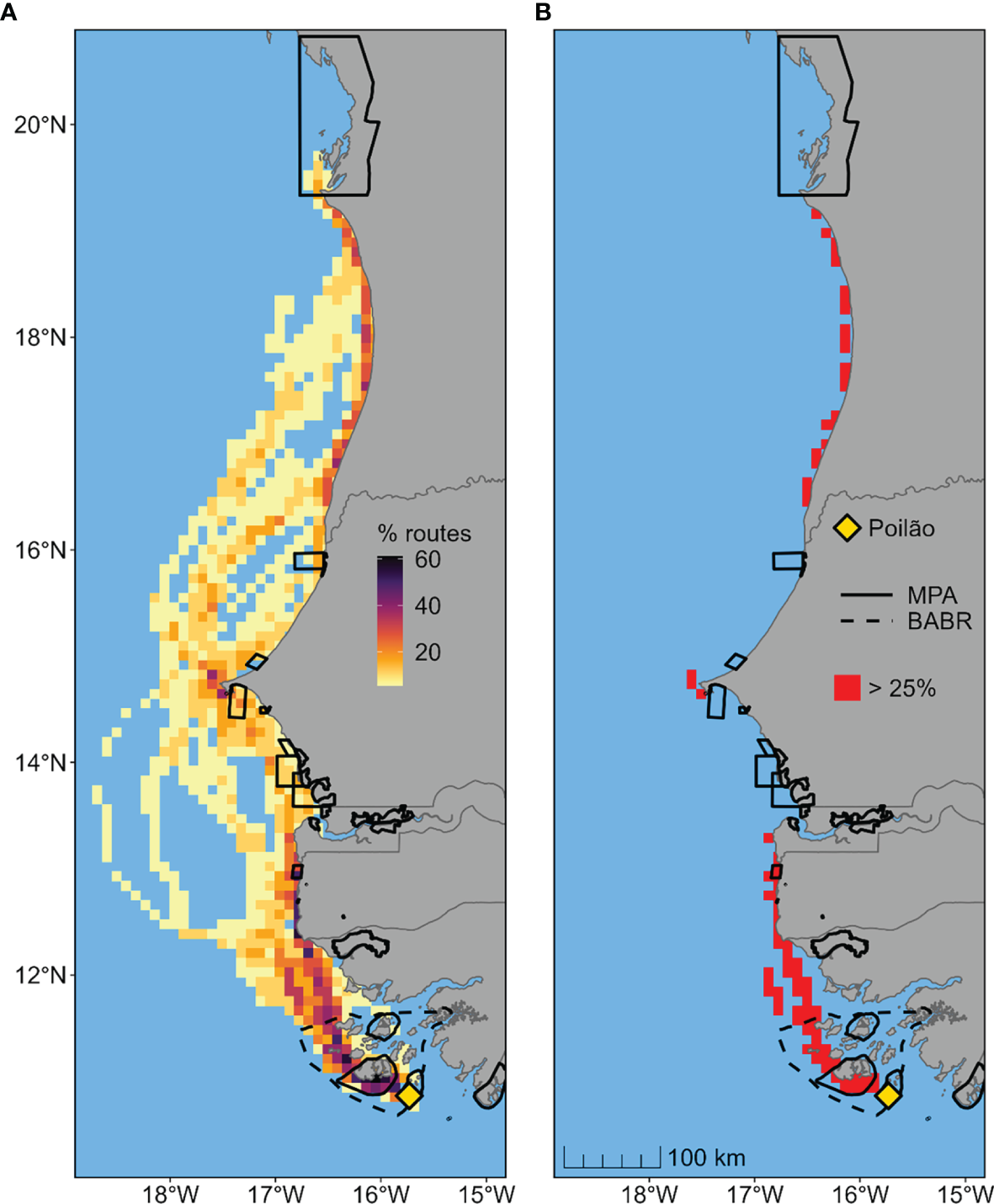 Migration routes of 18 female green turtles (Chelonia mydas) travelling from the nesting island in Guinea-Bissau (i.e., Poilão Island) to foraging areas in Senegal, The Gambia or Mauritania. (A) Percentage of overlapping migration routes, defined as 95% probability areas estimated using dynamic Brownian bridge movement models. (B) Identified high-passage corridors, defined as grid cells used by at least 25% of migrating turtles. Black solid and dotted lines represent existing conservation areas in the region. (Marine Protected Areas [MPA] and UNESCO Bolama-Bijagós Biosphere Reserve [BABR]).