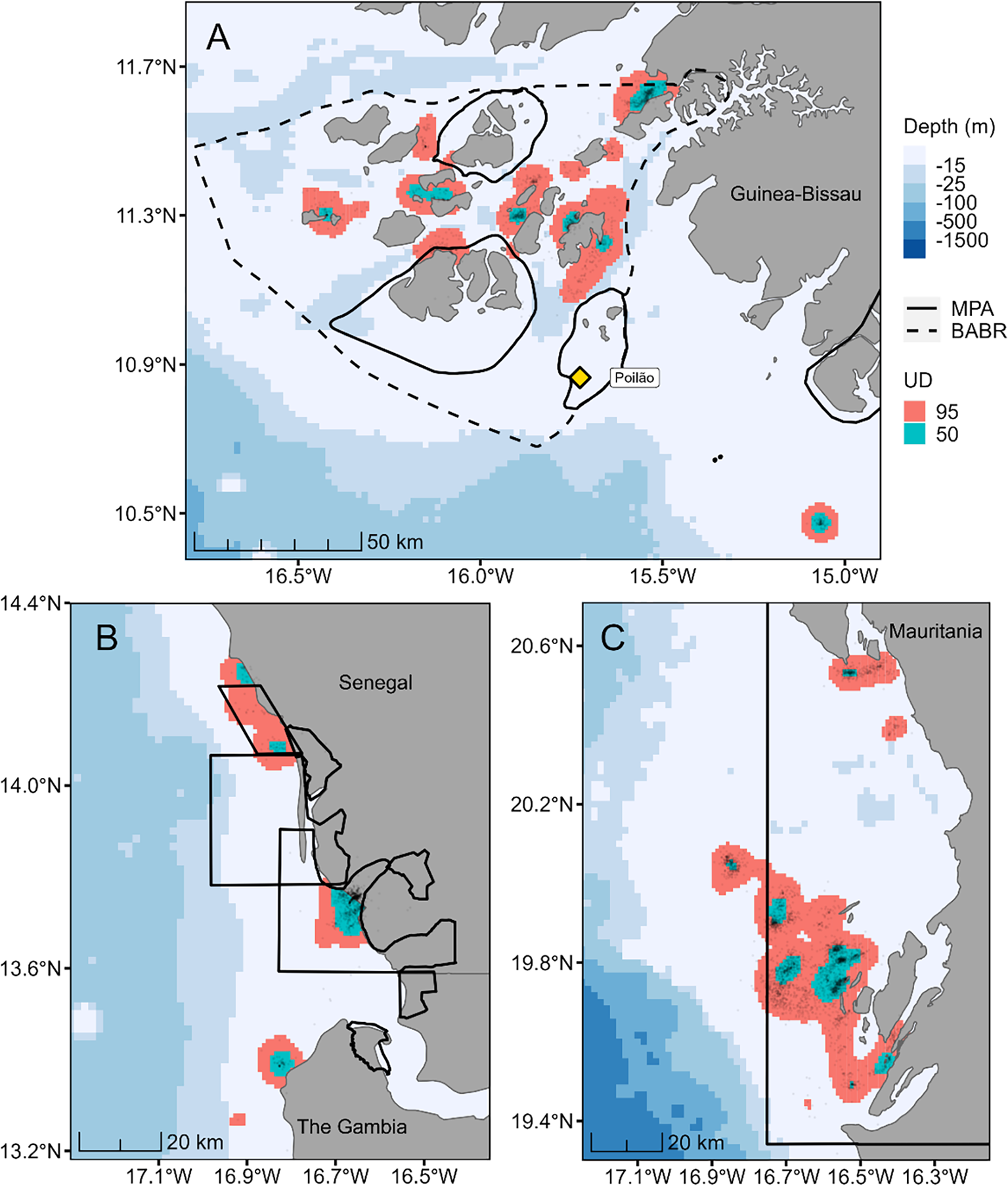 Distribution of 35 female green turtles (Chelonia mydas) tracked during the post-nesting foraging period in (A) the Bijagós Archipelago of Guinea-Bissau and south of the Bijagós (n = 12), (B) the Saloum and Gambia river deltas of Senegal and The Gambia (n = 10) and (C) the Bay of Arguin in Mauritania (n = 13). Black dots represent tracking locations, and the underlying colored areas represent the 95% (pink) and 50% (blue-green) utilization distribution areas, respectively signifying the population-level home range and core-use areas during foraging. The bold solid lines indicate the location of existing marine protected areas (MPAs) and the dashed line shows the extent of the BABR biosphere reserve.