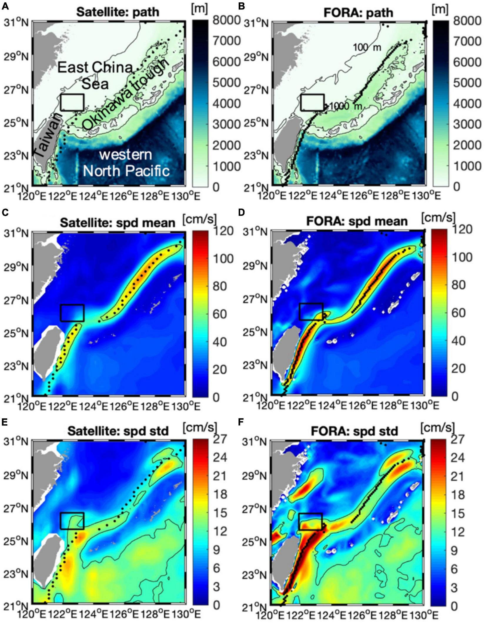 (A,B) Bathymetry from ETOPO2 and the mean path of the Kuroshio; (C,D) mean and (E,F) standard deviation of the surface current speed from monthly mean satellite altimetry for 1993–2018 (left) and monthly mean FORA for 1993–2014 (right). Black contours in panels (A,B) denote 100 and 1,000 m isobaths. The mean path of the Kuroshio, derived by longitudinal positions of maximum current speed at each latitude grid, is displayed as black dots. Black squares denote the Kuroshio shelf intrusion (KSI) domain, and black contours in panels (C–F) denote the 60 cm/s mean speed and the 12 cm/s standard deviation, respectively.