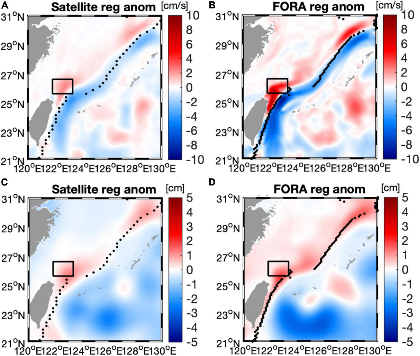 Regressed anomalies of (A,B) surface current speed and (C,D) sea surface height targeting the KSI strength modes. Regression analysis was based on satellite altimetry for 1993–2018 (left) and FORA for 1993–2014 (right). The mean path of the Kuroshio is displayed as black dots. Black squares denote the KSI domain.