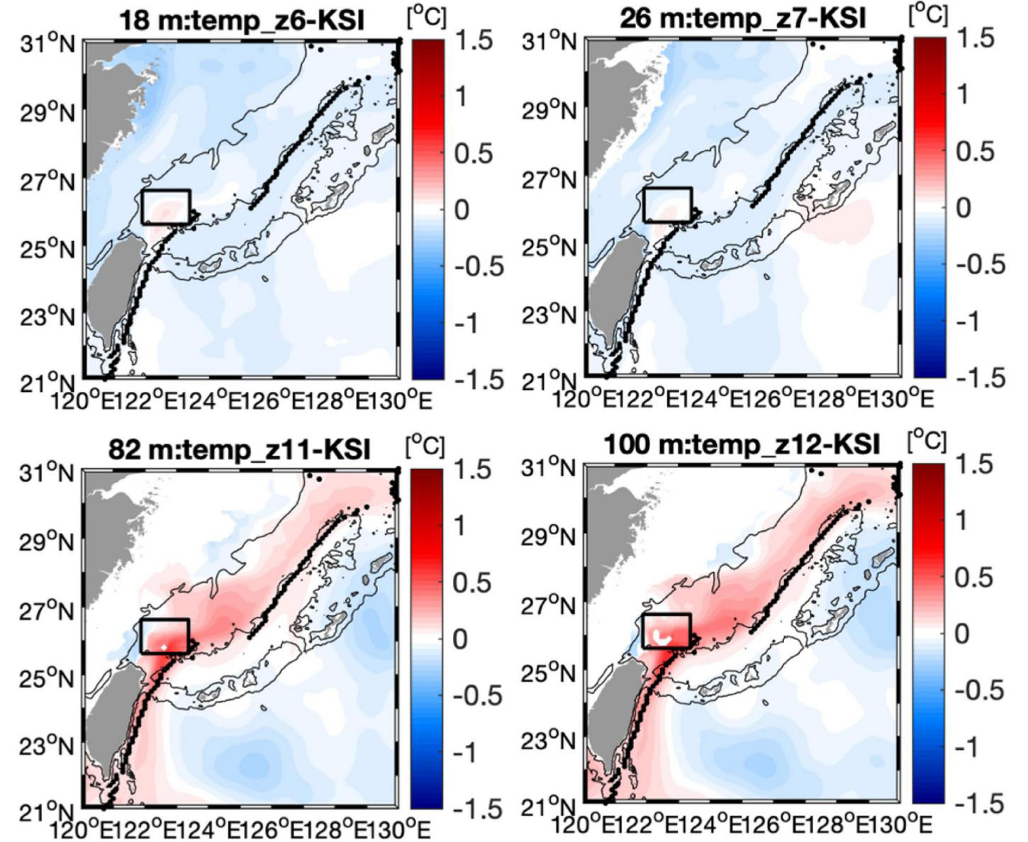 Regressed subsurface temperature anomalies at 18, 26, 82, 100 m targeting the KSI strength mode from FORA. The mean path of the Kuroshio is displayed as black dots. Black squares denote the KSI domain, and black contours denote 100 and 1,000 m isobaths.