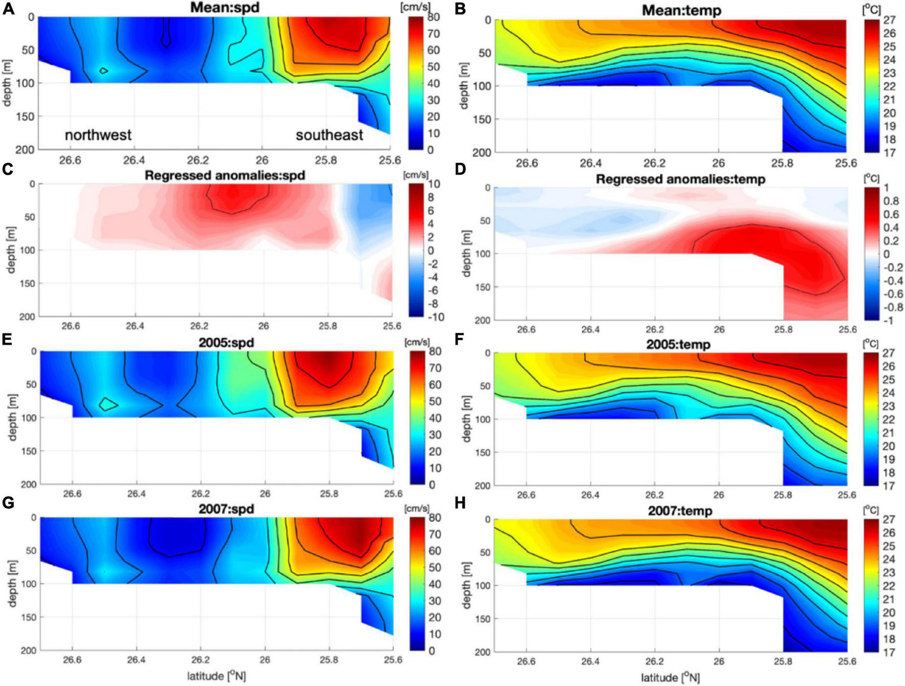 Vertical sections (northwest to southeast) of the (A,B) mean and (C,D) regressed anomalies diagonally crossing the KSI domain: (A,C) current speed and (B,D) temperature. Panels (E–H) display current speed and temperature in 2005 (when the KSI was strong) and 2007 (when the KSI was weak), respectively. Black contours in panels (C,D) denote 4 cm/s and 0.4°, respectively.
