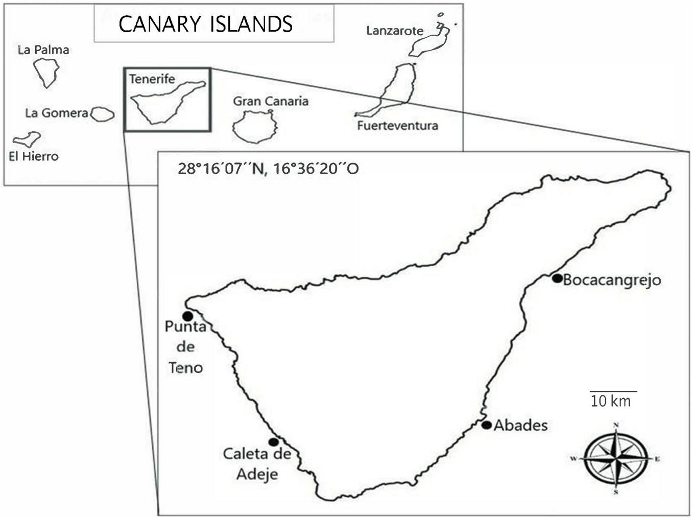 Sampling from four locations on the island of Tenerife was conducted (28°16′07″North, 16°36′20″West): Boca Cangrejo, Abades, La Caleta de Adeje and Punta de Teno (Figure 1) before the storm season in August 2020 and during the month of January 2021, some days after the Filomena was finished. The storm produced waves of 2 to 3 m from the S and SW (Figure 2). Generally, Tenerife Island is affected by trade winds that generate waves of moderate energy with an annual medium height of 1.4 m. Between October and March, the sea swell intensifies and winds from the North Atlantic approach the island from the north/northwest (NNW) and northwest (NW), producing waves of 2 to 3 m. Due to the orientation of coasts, the eastern and southern shores of the island are more protected from the NW/NNW swells, and the average wave is less than in other orientations (Yanes et al., 2006).