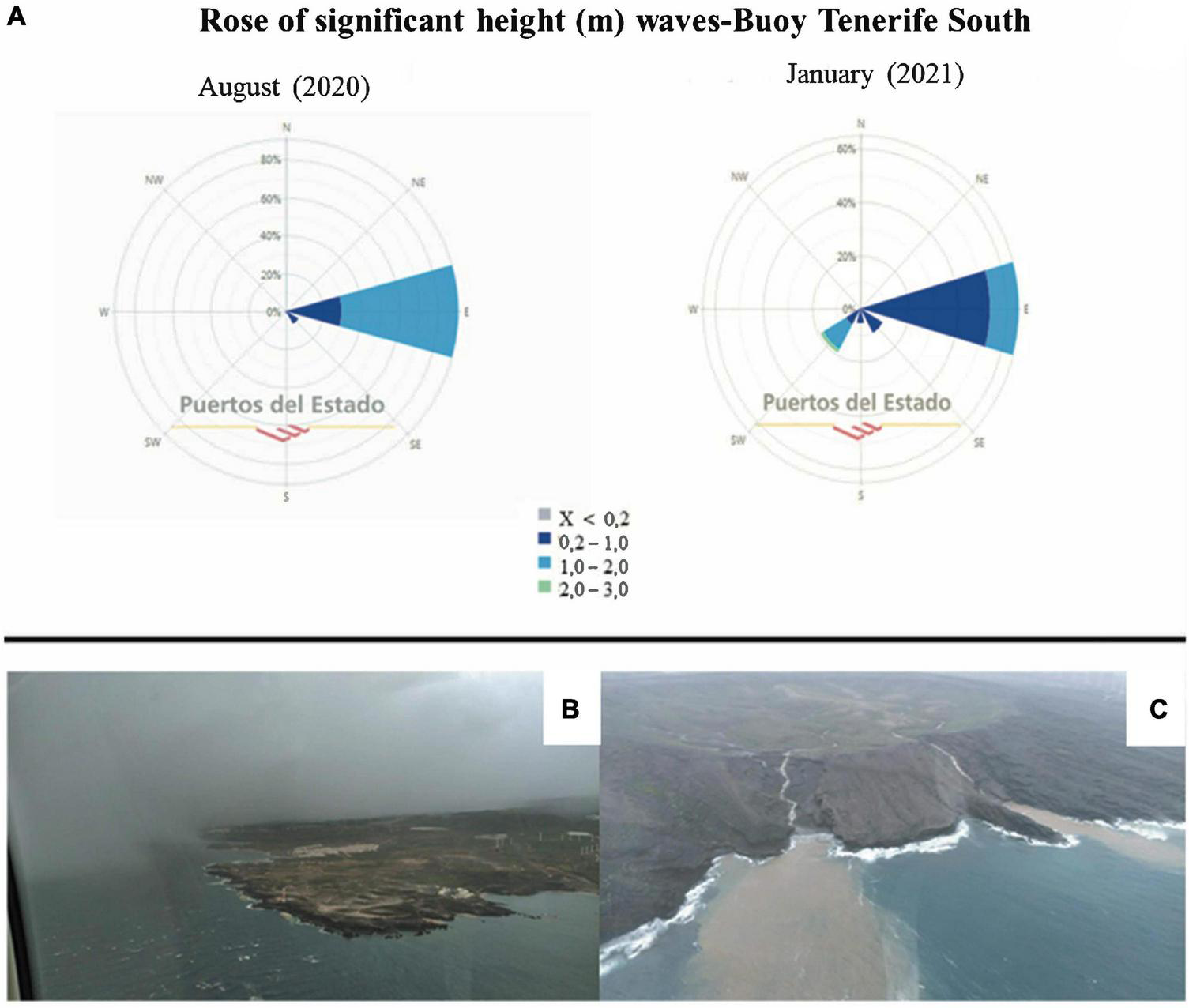 (A) Significant wave height Rose (m) for August 2020 (pre-storm) and January 2021 (post-storm) from the buoy of Tenerife South (del Estado, 2021). (B) Image of Pta. Rasca (south tip of Tenerife), where the westerly weather is clearly visible during the period of Filomena storm; (C) Image of Montaña Pelada (Tenerife), where the flow of the ravines in the post-storm period is clearly visible. Aerial photographs by Ignacio Herranz Duarte.