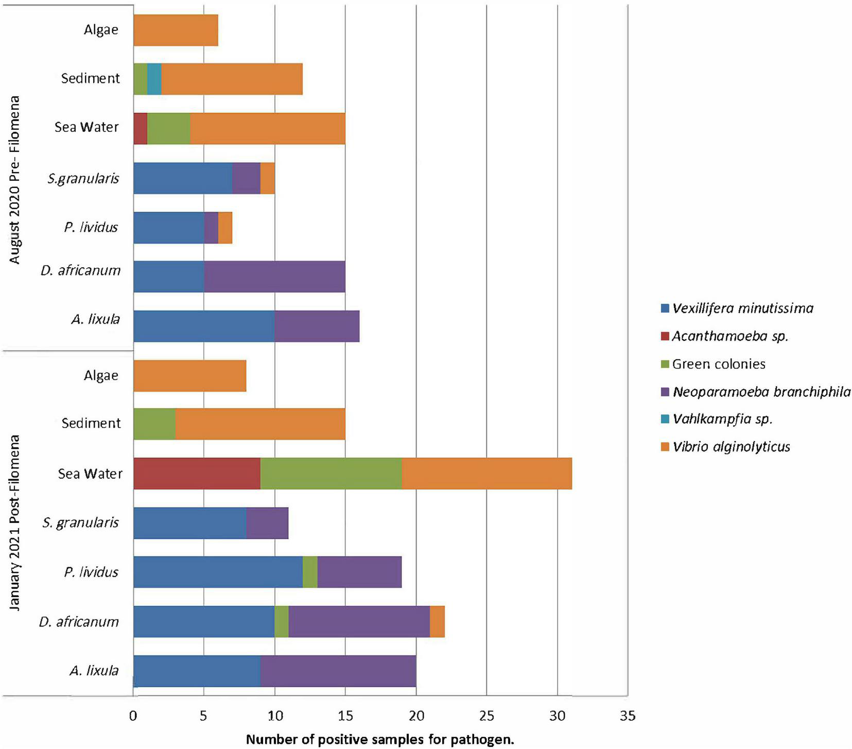 A total of 156 cultures from the August 2020 sampling were examined, 78 in ANN culture media and 78 in TCBS culture media. In January 2021, 152 cultures were examined, 76 in ANN and 76 in TCBS. Six different pathogens were found: (1) yellow colonies of the bacteria Vibrio alginolyticus, (2) green colonies of bacteria Vibrio sp., and (3) the amoeba Acanthamoeba sp., (4) the amoeba Vahlkampfia sp., (5) the amoeba Neoparamoeba branchiphila and (6) the amoeba Vexillifera minutissima. In January 2021 (post-Filomena storm) a higher number of positive per sample were obtained for all pathogens. Particularly, in the seawater samples, highlighted by the large number of positive for three pathogens: (1) green colonies of Vibrio sp., (2) V. alginolyticus and (3) Acanthamoeba sp. (Figure 3).