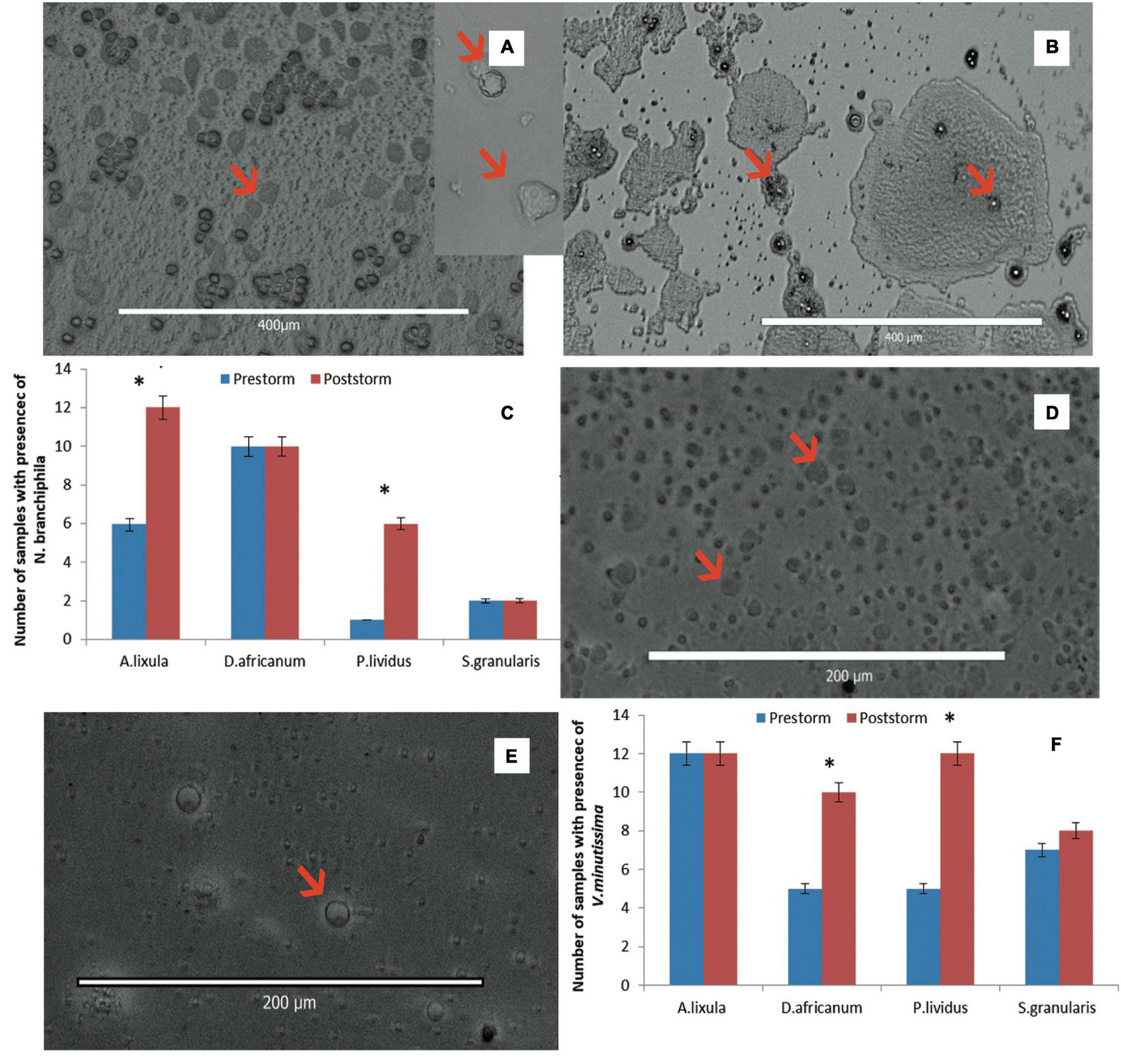 (A) Trophozoites and cyst of Acanthamoeba genotype T4, the arrows shows the double-walled cysts and the shape of trophozoite; (B) cysts of Vahlkampfia sp. in a sediment sample from Abades; (C) bar graph that shows the presence of N. branchiphila in sea urchins before (pre-) and (post-) Filomena’s storm (5% error bars), asterisks shows significant differences of P < 0,005; (D) pseudocysts of N. branchiphila(E) typical pseudocysts of N. branchiphila; (F) bar graph that shows the presence of Vexillifera minutissima in sea urchins before (pre-) and (post-) Filomena’s storm (5% error bars), asterisks shows significant differences of P < 0,005.