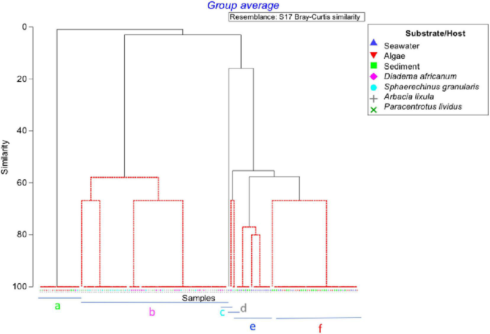 SIMPROF dendrogram showing the significant six clusters of samples formed in red. Each group has a letter from a to f.