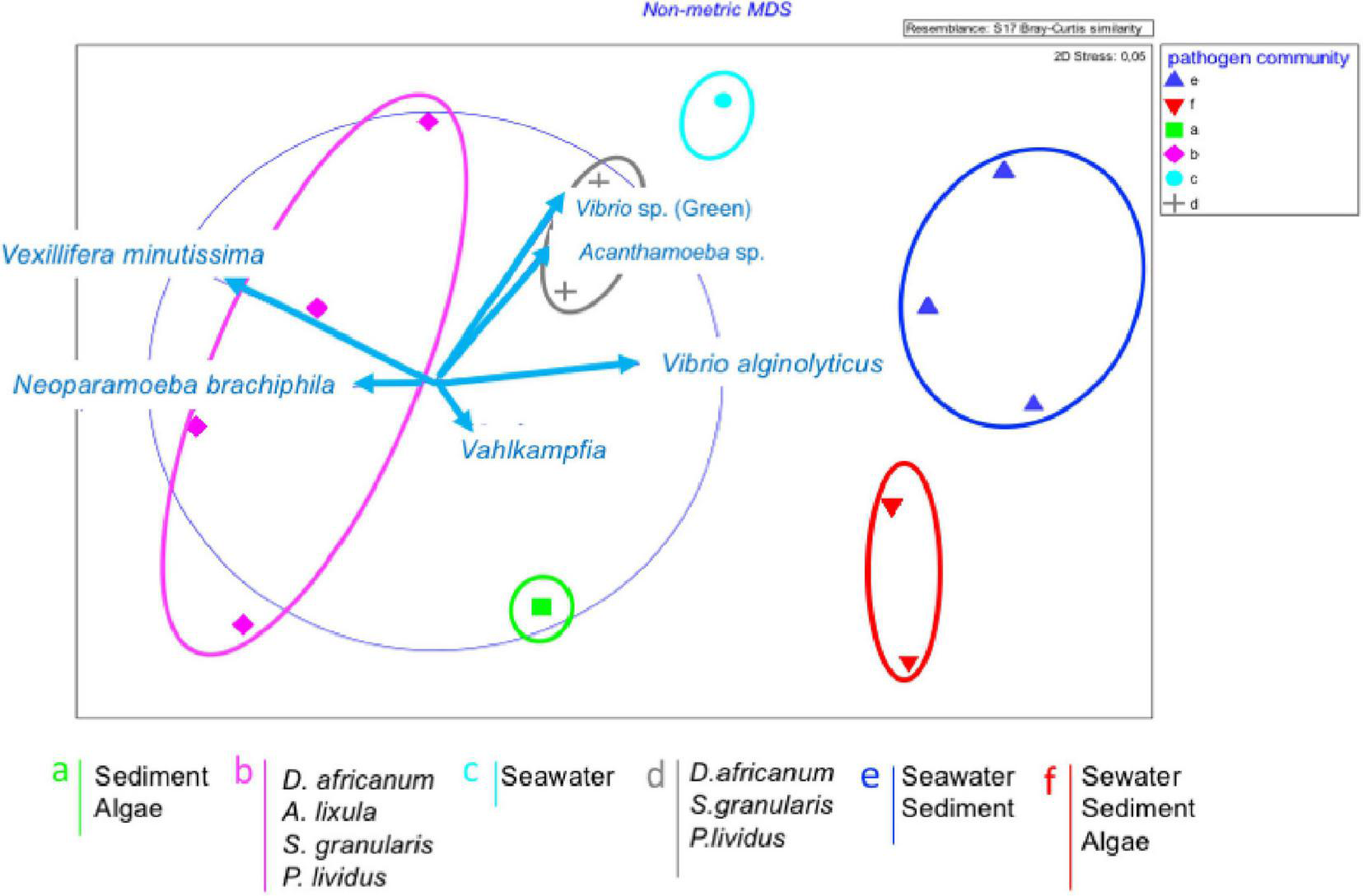 Non-metric multidimensional scaling (nMDS) plots of the dominant pathogen clusters and assemblages. Dominant pathogens which highlight the differences are shown as vector.