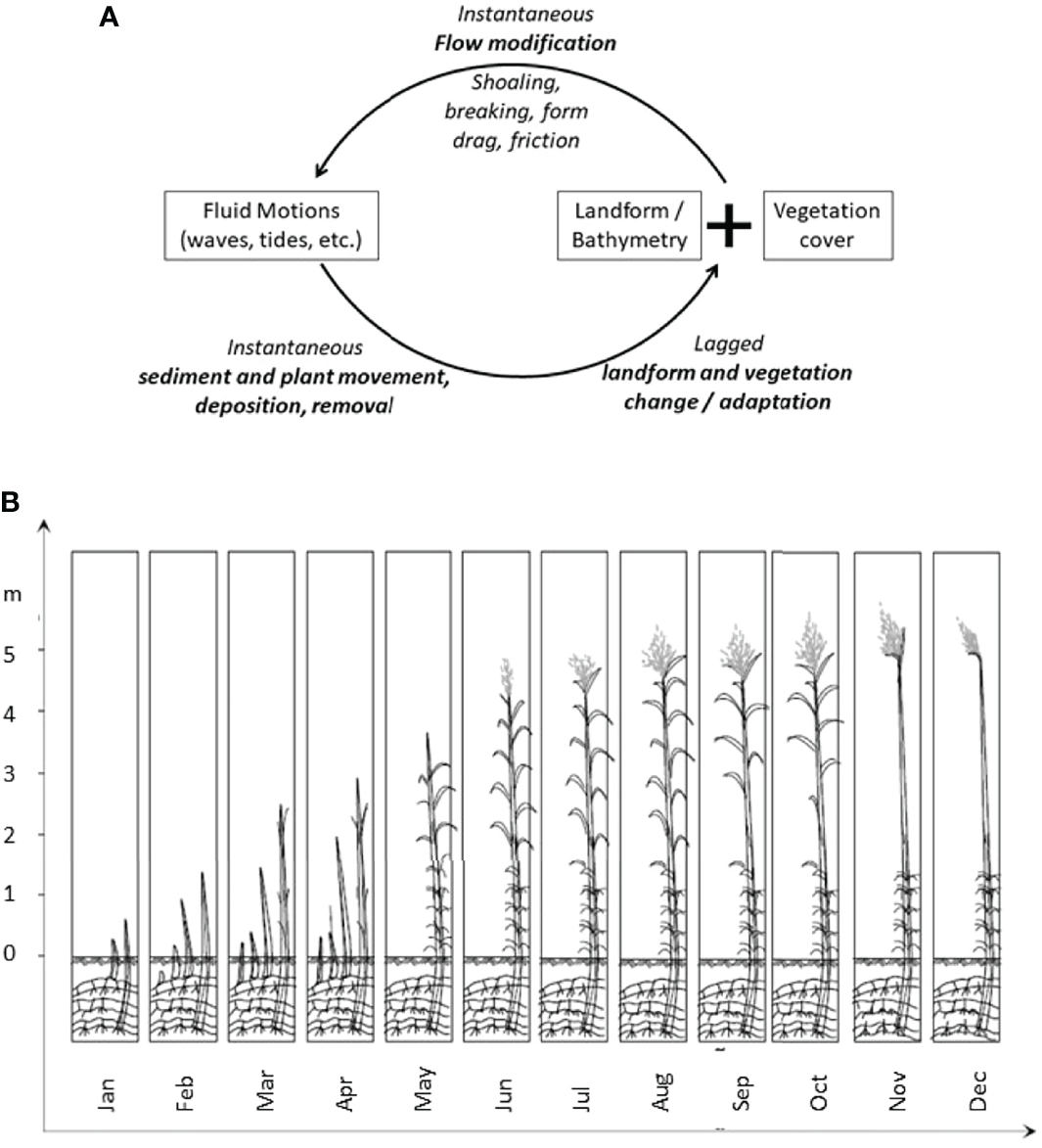 At an instantaneous time-scale but with decadal consequences, a single extreme storm event or tsunami, while being dissipated by the wetland, can also remove above-ground plant biomass through exerting extreme flow-generated forces on biota (Cahoon, 2006). This, in turn, alters the biological attributes of the ecosystem in a way that has an immediate effect on the landform and its subsequent effect on water flow in a feedback relationship (Figure 1A) (Howes et al., 2010; Leonardi et al., 2018).