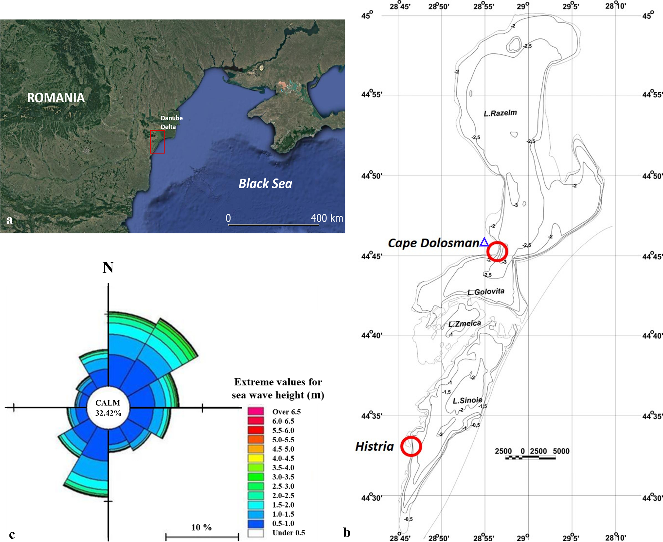 (A) Location of the Razem-Sinoe Lagoon System, in the Danube Delta, Romania; (B) Site 1 (Cape Dolosman) and Site 2 (Histria),shown as red circles in the north and south of the lagoon system, respectively and Jurilovca meteorological station (blue triangle). Detailed bathymetric map of the lagoon system, redrawn from Dimitriu et al., 2008. (C). Wind rose offshore Danube Delta Black Sea Shore (July 1992 – December 2010) (Halcrow, 2012).