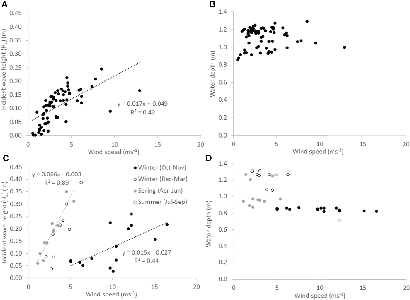 Incident wave height and water depth conditions accompanying different wind speeds during wave recording events at Histria (A, B) and Cape Dolosman (C, D). Regression lines and equations are shown for all data at Histria (A) and winter conditions only at Cape Dolosman (C), where data are shown for different seasons.