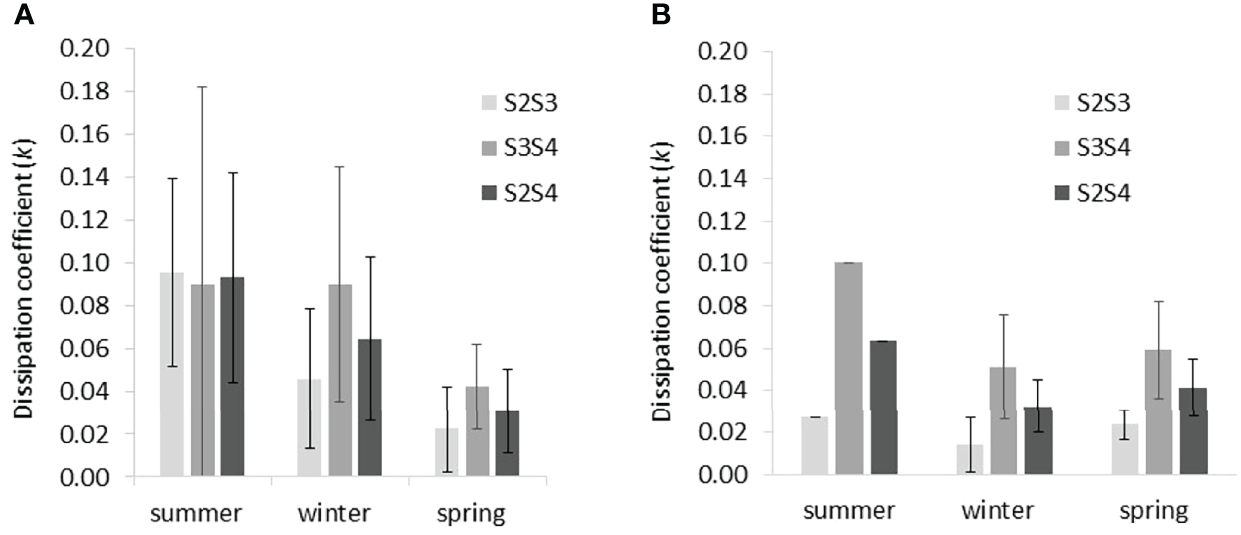 Seasonal variation in mean dissipation coefficients (k) derived empirically from observed wave height dissipation between pairs of sensors (S2S3, S3S4, and S2S4; see Figure 3 for sensor locations) at (A) Histria and (B) Cape Dolosman. Error bars indicate ± 1 standard deviation.