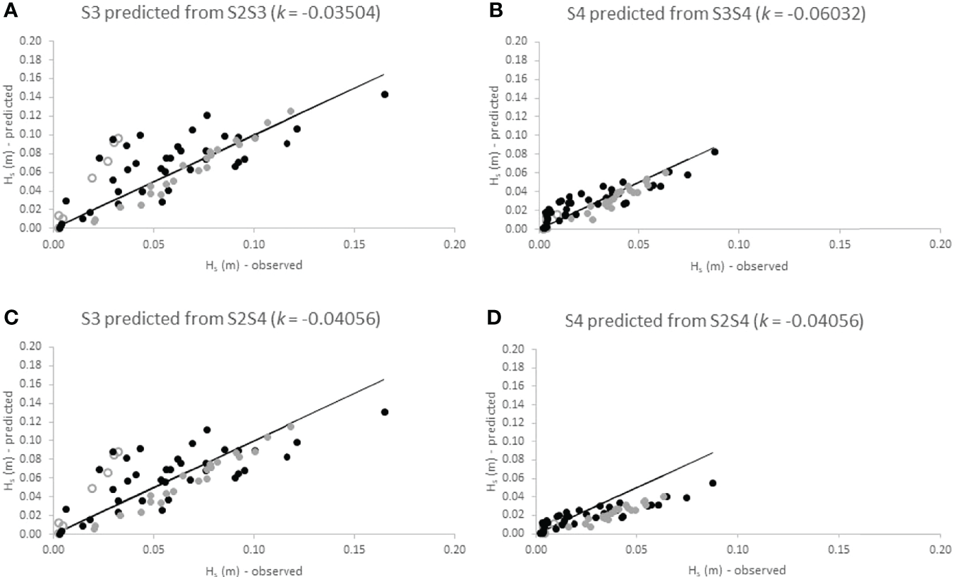 For Histria, Figures 7A, C show a clear deviation of measured wave heights at S3 from predicted heights in the summer season (open circles). For both scenarios (k for the S2S3 section and k for the S2S4 section), the exponential decay function over-predicts wave heights at the respective landward location in the summer. In spring, however, the exponential decay represents observed wave height decay relatively well (grey dots in Figures 7A–C). In winter, predictive ability is reduced and the exponential decay function both over- and under-predicts observed decay (black dots in Figure 7). The performance of the exponential decay function is comparatively better for the landward section (S3S4) than for the seaward section (S2S3). When predicting wave heights at S4 from the dissipation coefficient determined for the entire transect (Figure 6D), however, the exponential decay function over estimates wave heights for waves with Hs > 0.03 m at S2.