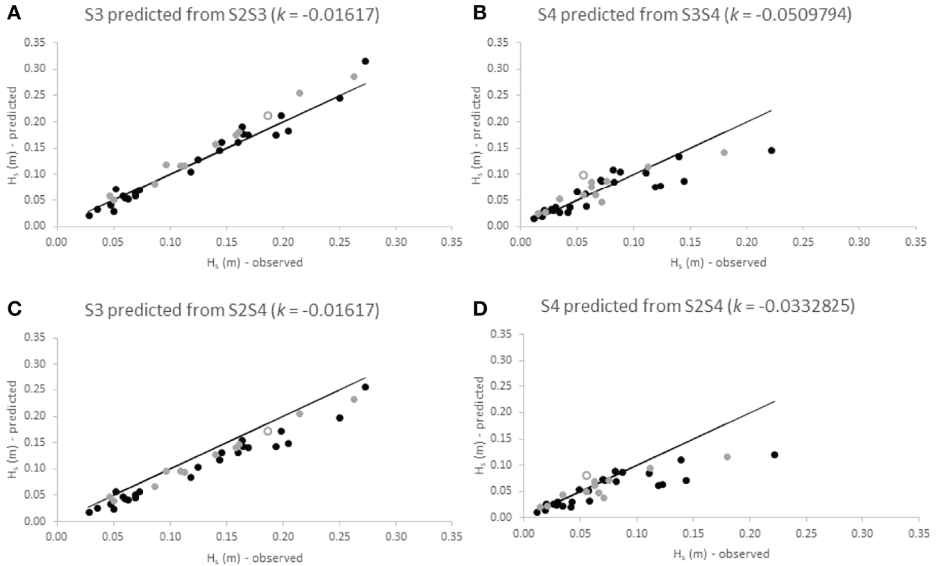 Observed significant wave heights at the landward location of transect sections S2S3 (A), S3S4 (B) and S2S4 (D) at Histria compared to wave heights calculated at those locations using the best-fit dissipation coefficient (k) as derived from observed wave height dissipation over all seasons for those respective transect sections. Panel (C) shows wave heights predicted for the middle location (S3) on the basis of k derived from observed dissipation between S2 and S4. Data is shown per season (open circles = summer; black dots = winter; grey dots = spring). Black lines indicate lines of direct correspondence between observed and calculated wave heights.