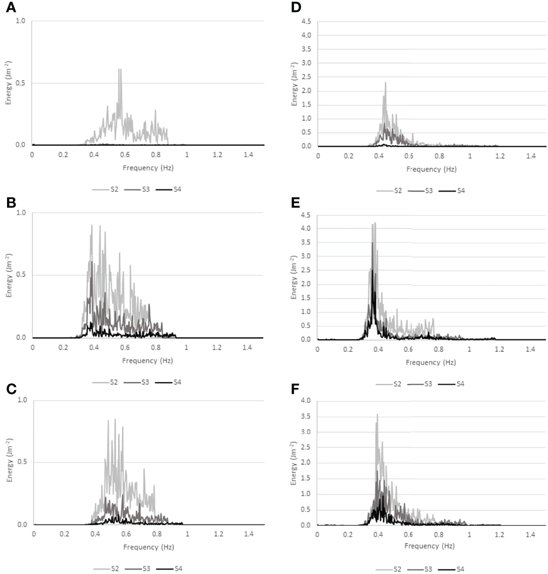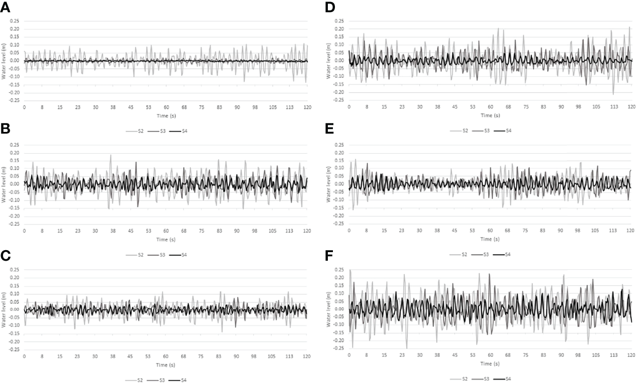 The first 2 minutes of water level fluctuations at all three transect locations (S2, S3 and S4) as reconstructed from depth-adjusted wave spectra at Histria (A–C) and Cape Dolosman (D–F) for the most energetic incident wave conditions (see Table 2 for dates and further information).