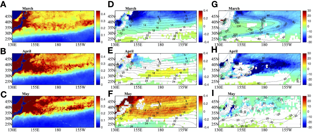 Climatological mean of SeaWiFS chlorophyll concentration (mg m-3) for (A) March, (B) April and (C) May. Shaded in (D–F) are for SST differences between CLIMCHL and NOCHL, and contours are for SST of NOCHL (°C). Shaded in (G–I) are for MLD differences between CLIMCHL and NOCHL, and contours are for MLD of NOCHL (M). SST and MLD differences are at 95% significant level.