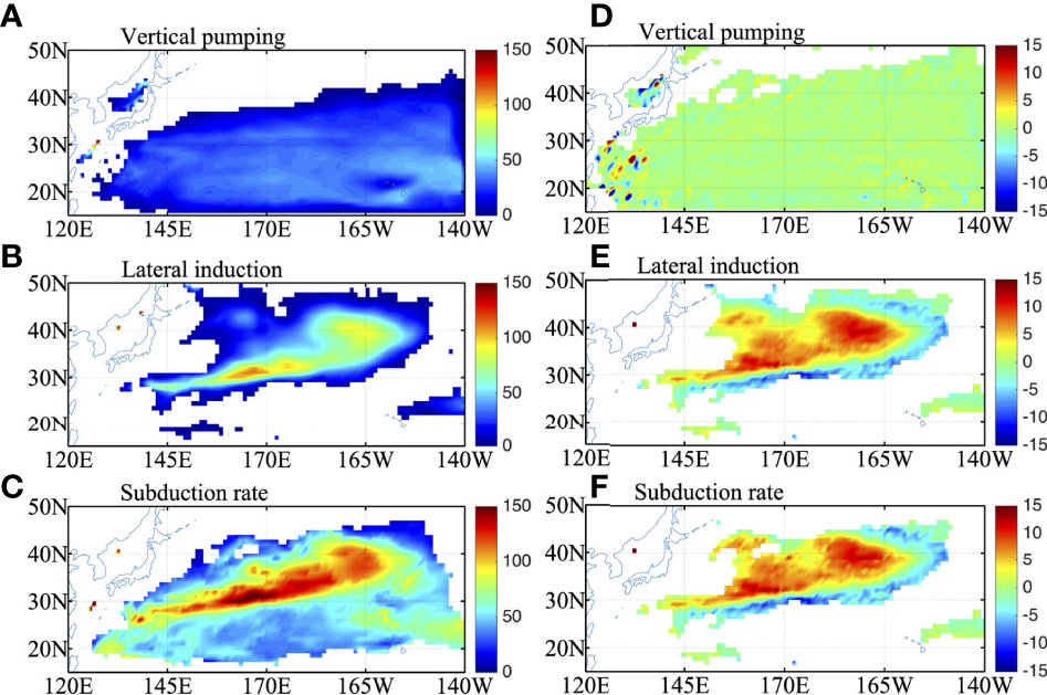 (A) vertical pumping, (B) lateral induction and (C) the total subduction rate in NOCHL run in the north Pacific (m/year). (D–F) are the same as (A–C) but for the differences between the two experiments (CLIMCHL-NOCHL).
