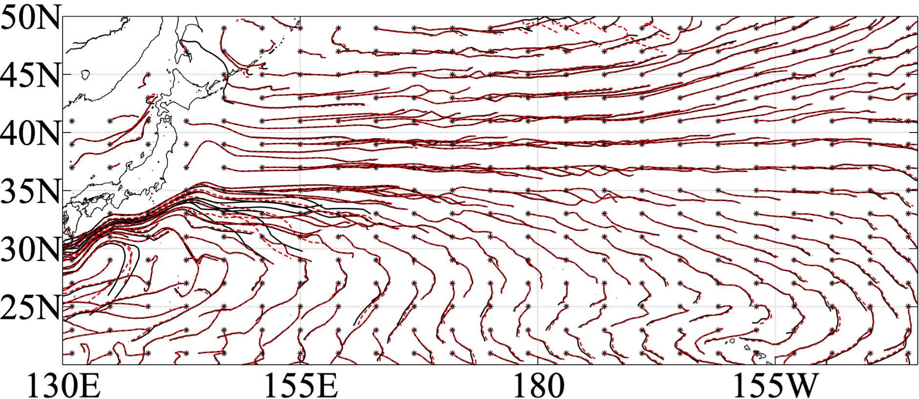 We have known that the ocean biological effects mainly impact lateral induction, which is associated with MLD front strength. Lateral induction is determined by the MLD difference between the first and second March on the water parcel trajectory (second term on the right-hand side of Eq. (2)). Therefore, either the deeper MLD in the first year or the shallower MLD in the second year could increase lateral induction. Besides, the larger horizontal movement of water parcels could also lead to increase of lateral induction. To investigate how ocean chlorophyll impacts lateral induction, Lagrangian trajectories are compared for the two experiments (Figure 9). Most water parcels between 30°N and 40°N move eastward, and the water parcels in the south (approximately 30°N) move southeastward, with little difference between the CLIMCHL and NOCHL runs, except in regions between 25°N and 35°N near the western boundary (Figure 9). Little difference between trajectories shows that the lateral induction differences between CLIMCHL and NOCHL runs are mainly caused by strength of the MLD front differences, not by the difference of the trajectories.
