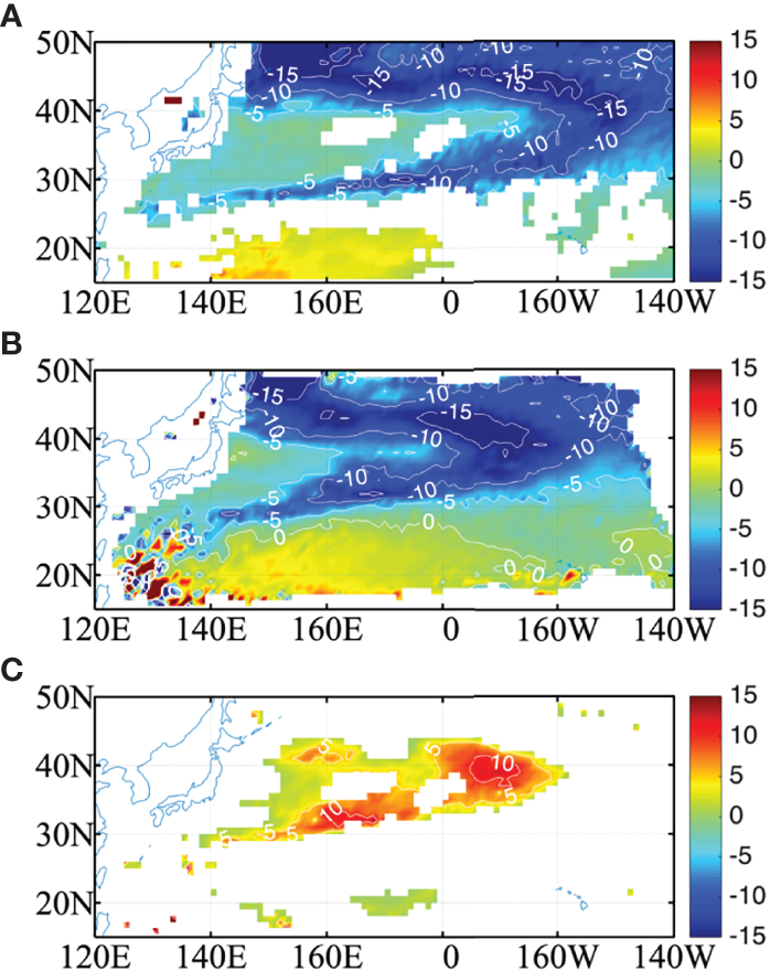 To check whether the lateral induction increase is related to the stronger MLD front, the MLD differences between the two experiments in the first and second years and their differences are shown in Figure 10. In general, the MLD of CLIMCHL is shallower compared with the NOCHL run due to the biological effect, especially in the shallower MLD region. In the first March, MLD differences between CLIMCHL and NOCHL are negative in the study region, with less than 5 m differences in the center of 30°N-40°N and more than 5 m differences around the MLD front (Figure 10A). This indicates that the horizontal MLD gradient of the CLIMCHL run is stronger than that of the NOCHL run. As the water parcels move to the east and south, the MLD is shallower, and the MLD differences between the two experiments increase to more than 10 m in the second March (Figure 10B). As a result, the lateral induction differences between experiments show positive values in the region of 30°N-40°N (Figure 10C), with magnitude more than 10m/year in the center of the STMW (30°N-35°N, 150°E-180) and CMW (35°N-42°N, 180-160°W). That is, the much shallower MLD in the second year leads to an increase in lateral induction in the CLIMCHL run, which is caused by biological effects.