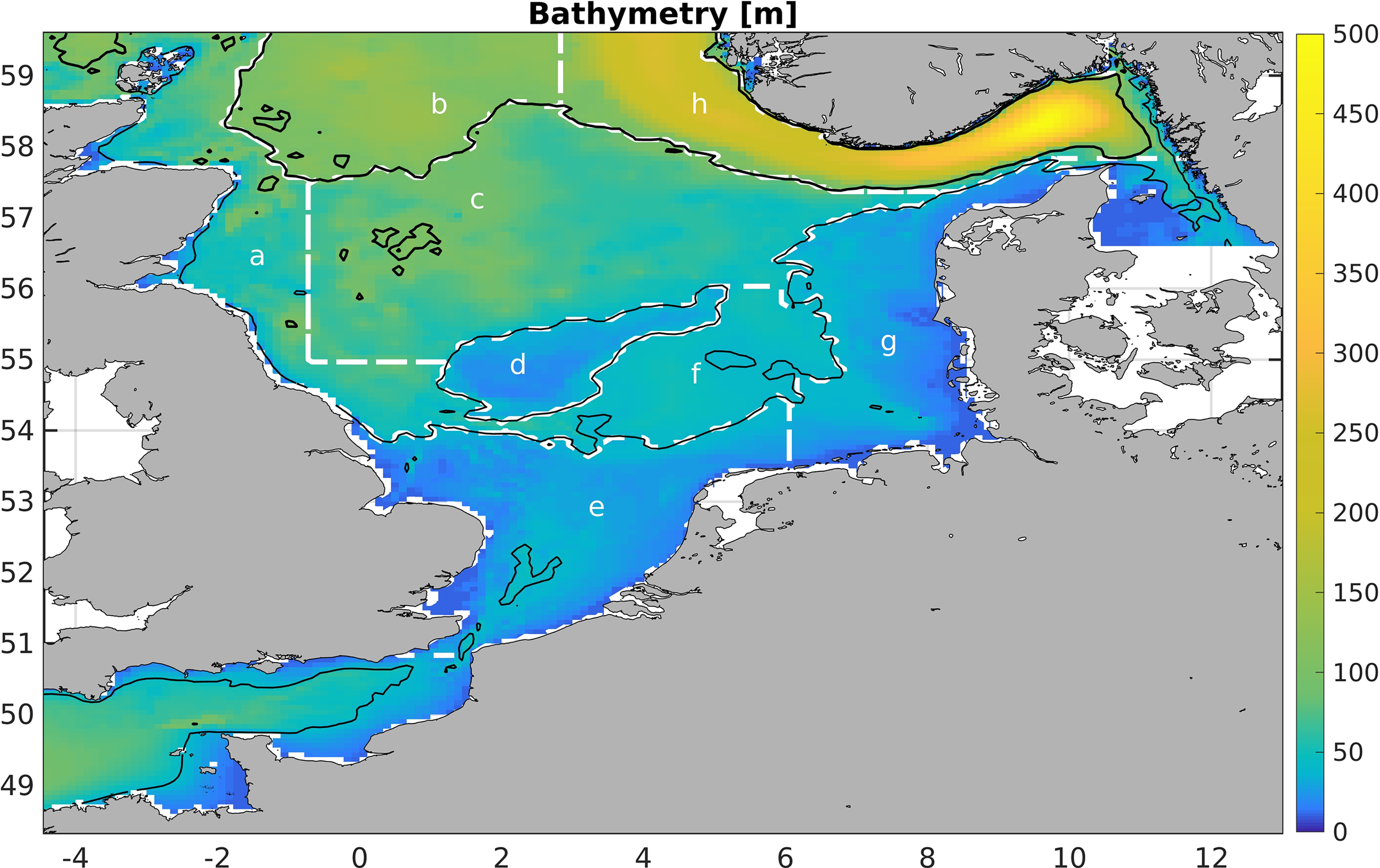 where χ is the respective quantity and A is the area. The areas’ names are north-western North Sea (a), central North Sea (b), northern North Sea (c), Dogger Bank (d), southern North Sea (e), Oyster Grounds (f), eastern North Sea (g) and Norwegian Trench (h). All boxes have a relatively homogeneous depth.