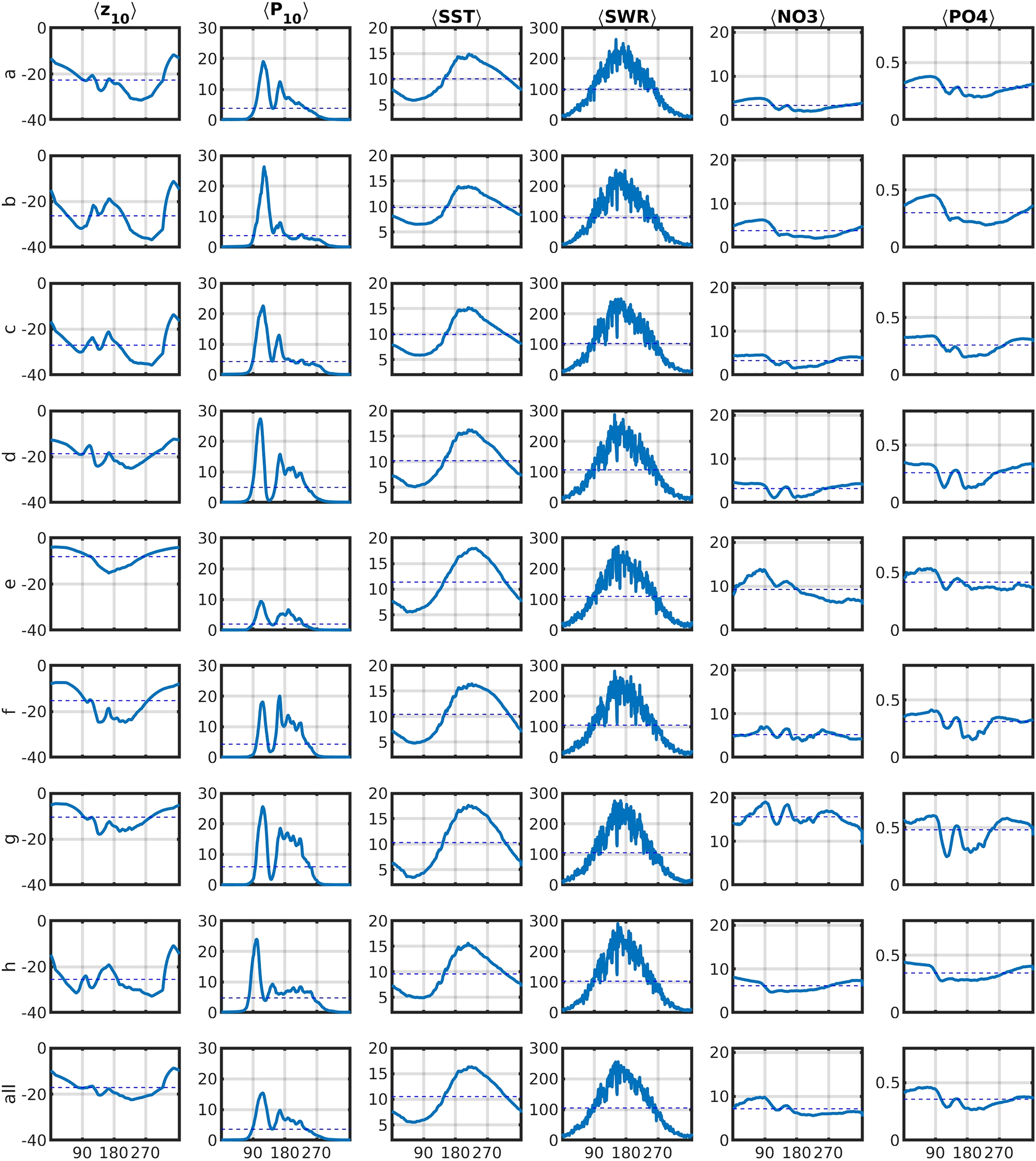 To filter out the effects of horizontal meso- and small-scale variability, we perform area averages of Z10, P10, SST, SWR and oceanic nutrients over specific regions, which are shown in Figure 1. The area averages are denoted by