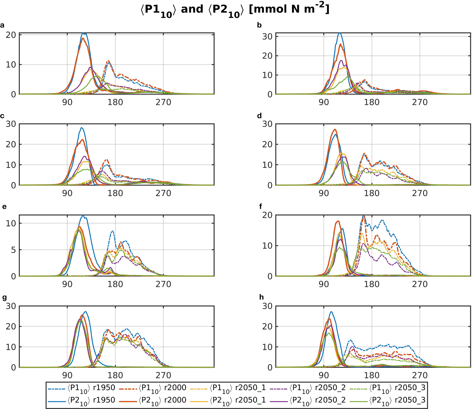All parameters used in this study are shown in Table 1. Figure 2 shows both the Q10 term and the P–I curves for both phytoplankton groups. It also shows the averages of sea surface temperature (SST) and short-wave radiation (SWR) for 1950, 2000 and the three different RCP scenarios in 2050, for the months March to May, as well as the annual SST means for the same time periods. This illustrates how changes in SST and SWR may affect plankton growth. Increases in temperature will lead to accelerated primary production, while increases in SWR due to climate change will likely not have a dramatic effect.