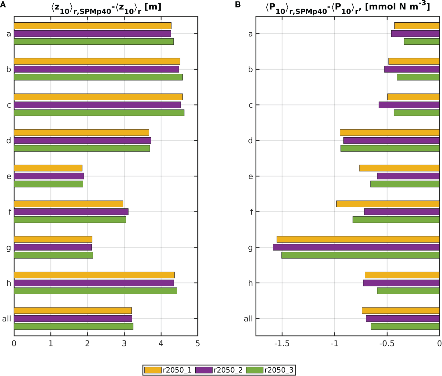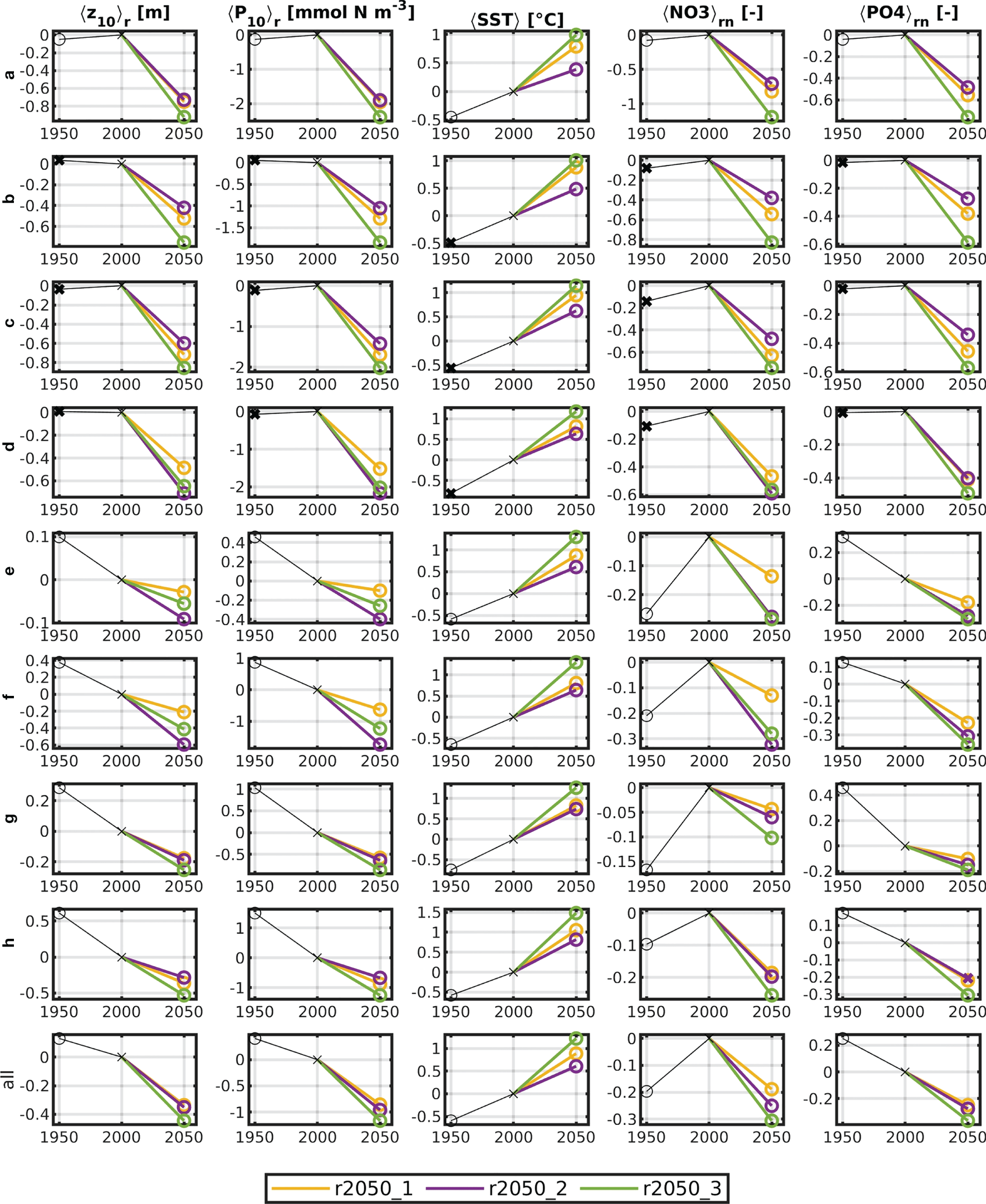 Because the natural ranges of NO3 and PO4 in the North Sea differ by two to three orders of magnitude, we normalized their residuals by the 5-year means of the area averages μ for the run r2000, yielding a relative quantity. The normalized quantities will be marked by the letter n in the index: