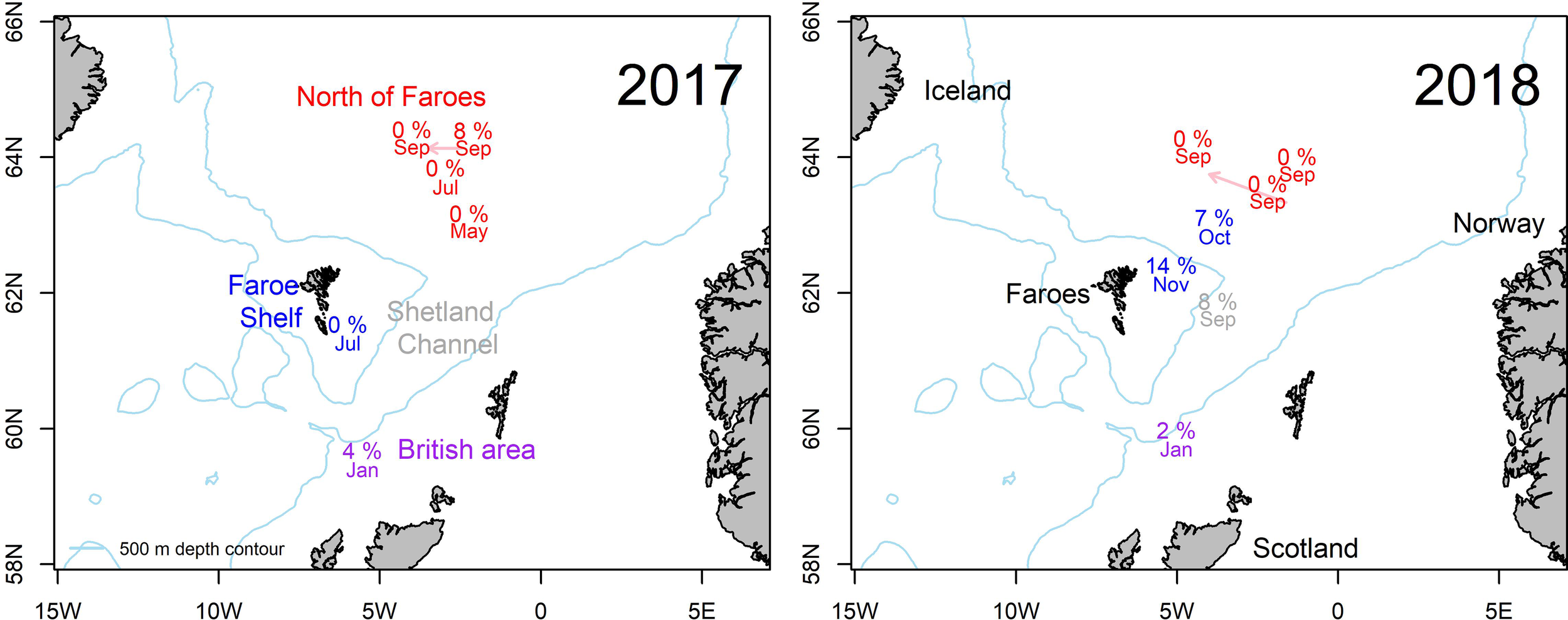 Map of the study area documenting sample locations. Prevalence of Kudoa thyrsites in Atlantic mackerel in 2017 (left) and 2018 (right). Month of capture and prevalence of infection is shown. Arrows indicate displacement of text label for plotting clarity. Text colours correspond to different sampling regions: North of Faroes (Red), Faroe Shelf (Blue), Shetland Channel (grey) and British Area (purple).