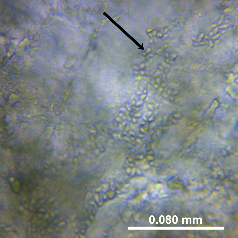 A total of 104 soft-flesh samples obtained from the factory processing plant in 2015 were examined both by microscope smears and qPCR (Table 2). The proportion of K. thyrsites spores (Figure 2) was 98% from microscope smears compared to 90% from qPCR. No samples scored positive by qPCR and negative by microscopy. In some cases it was possible to observe multiple spores in the soft-flesh mackerel specimens (Figure 3). The mean square contingency co-efficient calculated from the 2x2 contingency table was 0.43. A Fisher’s exact test also demonstrated a significant association (p<0.001) of detection outcome from the two methodological approaches.