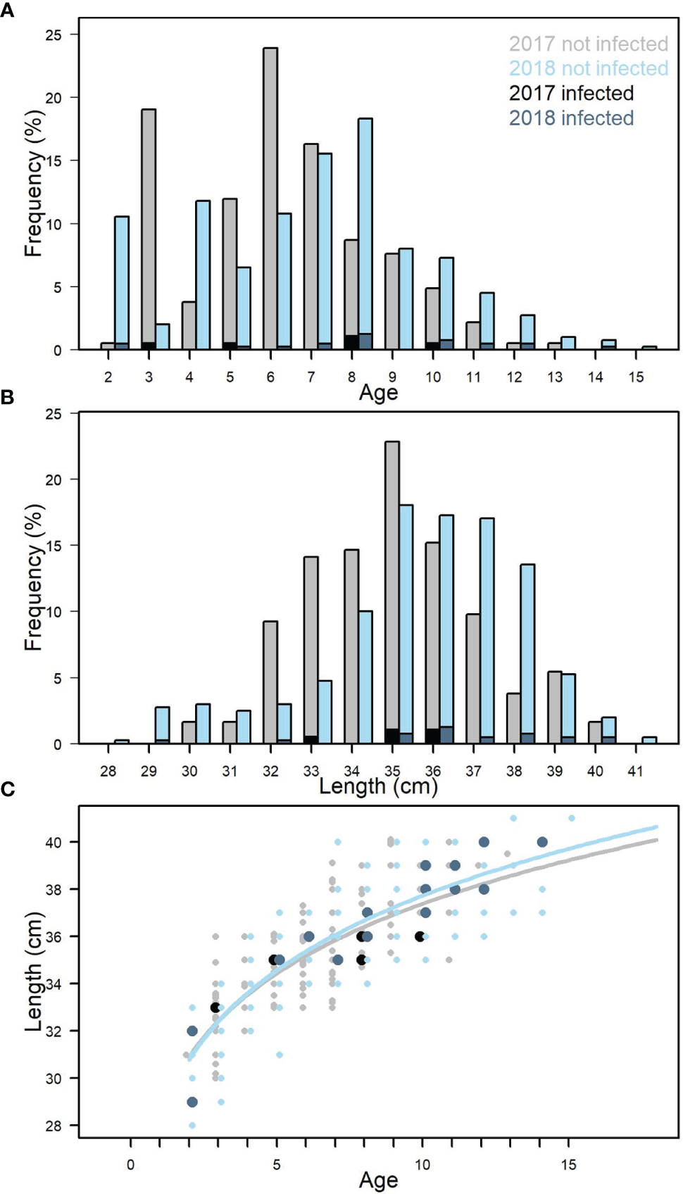 Age distribution for all samples from 2017 and 2018 (A). Length distribution for all samples from 2017 and 2018 (B). Length-weight relationship for all samples. 2017 and 2018 (C). Black and dark blue indicate fish infected with Kudoa thyrsites.