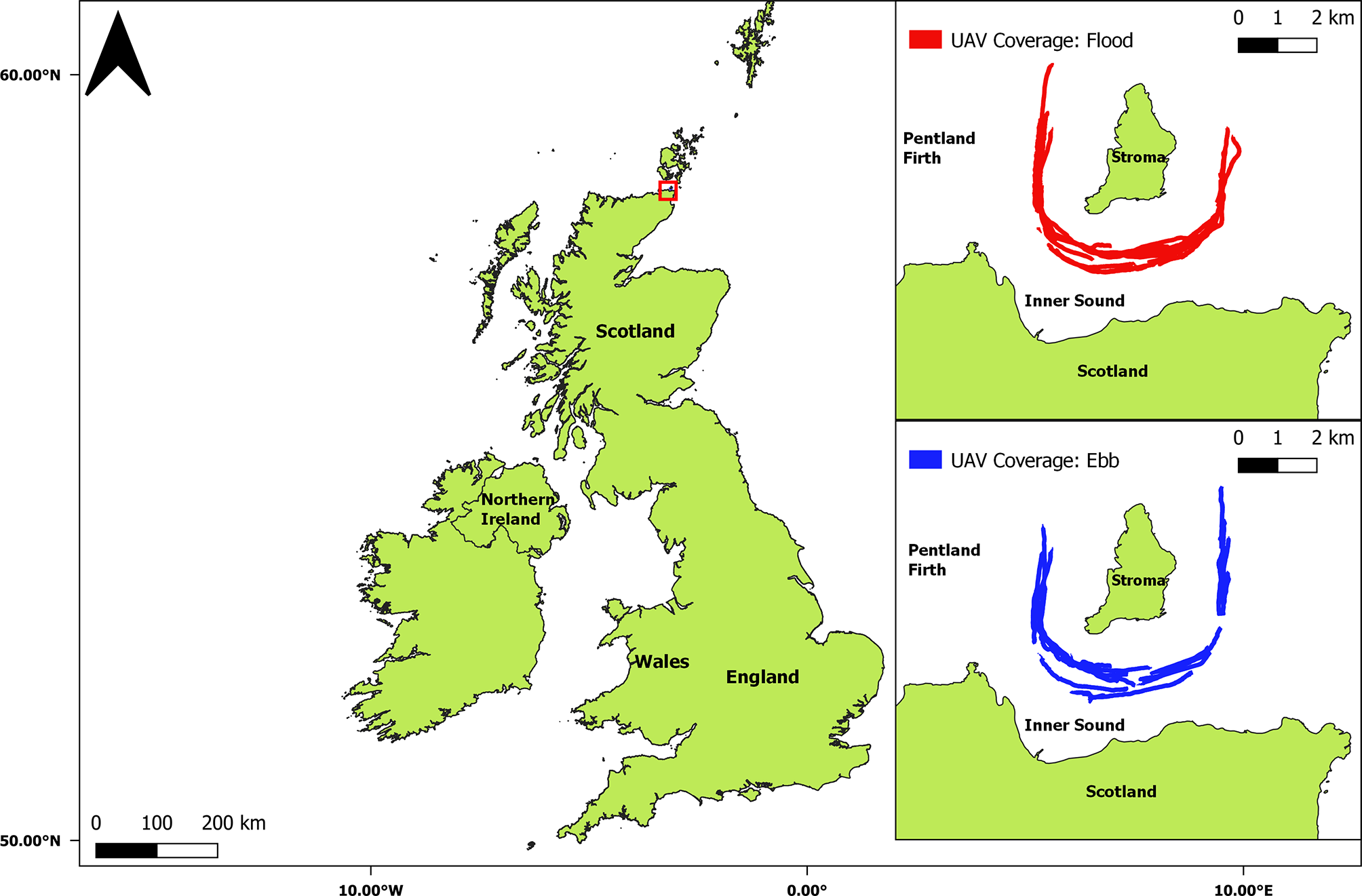 The United Kingdom and the Inner Sound of the Pentland Firth with UAV survey coverage displayed.