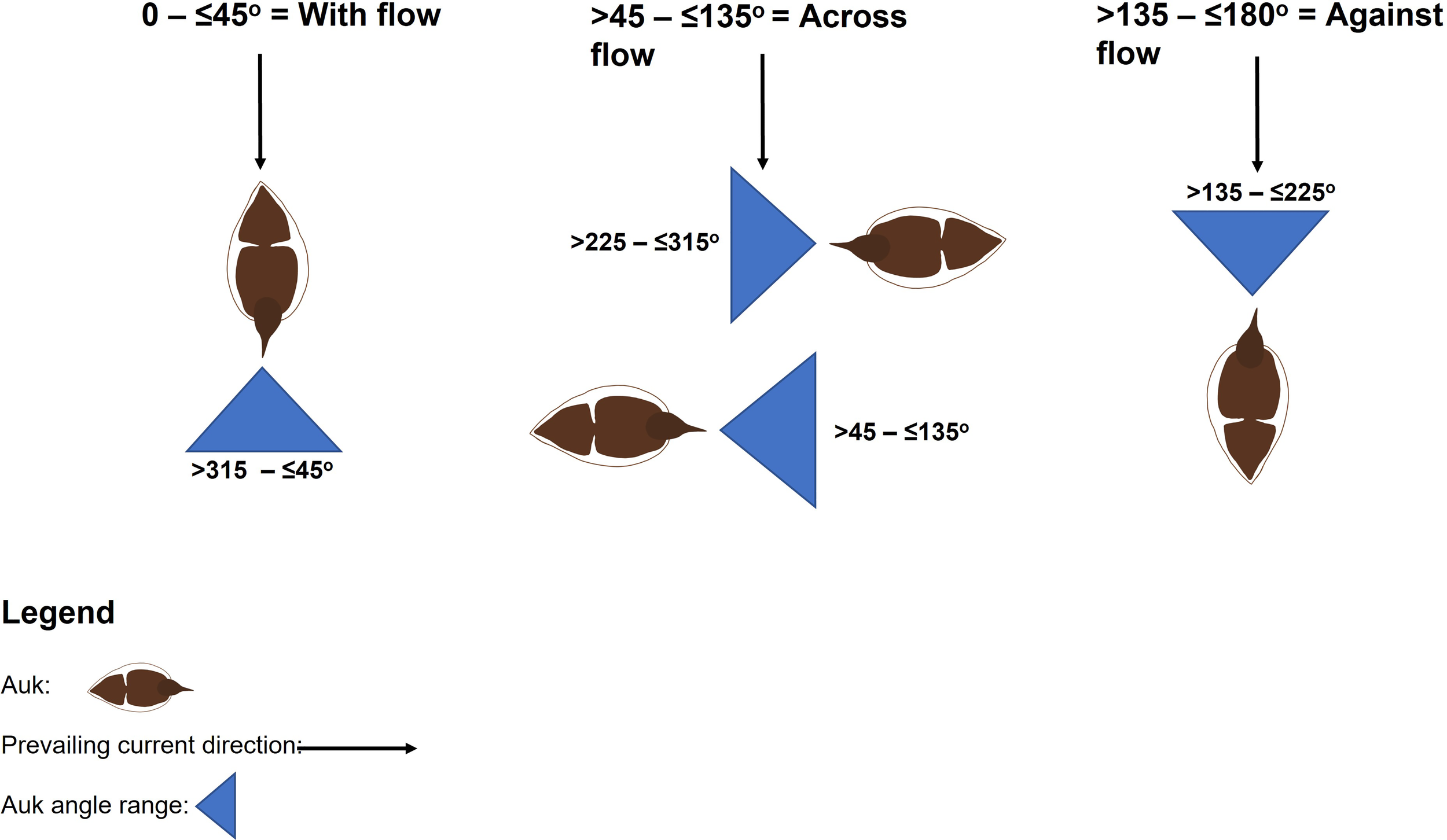 Categories were used to represent auk relative orientation and formed three classifications: with the flow (> 0 – ≤ 45°), across the flow (> 45 – ≤ 135°) and against the flow (> 135 – ≤ 180°) (Figure 3). Orientation relative to the flow was then examined in relation to hydrodynamic covariates (tidal phase and current velocity). Auk distribution was analysed in relation to kolk-boils present at the surface, detected within concurrent imagery, and the same hydrodynamic variables.