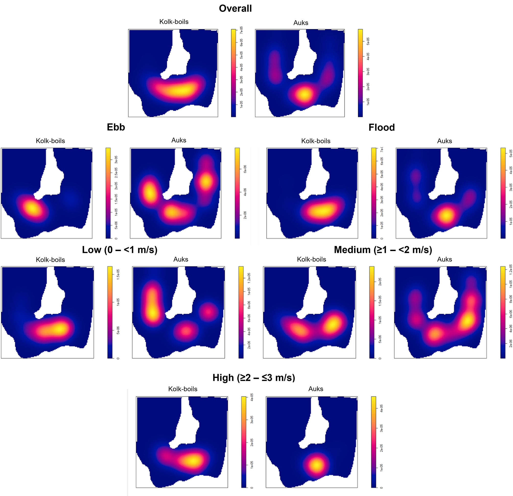 When subset by tidal phase, kolk-boil density distribution was greatest in the central to eastern areas of the Inner Sound on the flood phase (max density > 7x10-5 individuals/m²) and further west on the ebb phase (max density > 3x10-5 individuals/m²) (Figure 4). Auk density was more variable on the ebb phase (max density > 6x10-6 individuals/m²). On the flood phase clustering of auk density distribution (max density > 5x10-5 individuals/m²) was observed at the central area of the Inner Sound, slightly to the south of corresponding kolk-boil density.