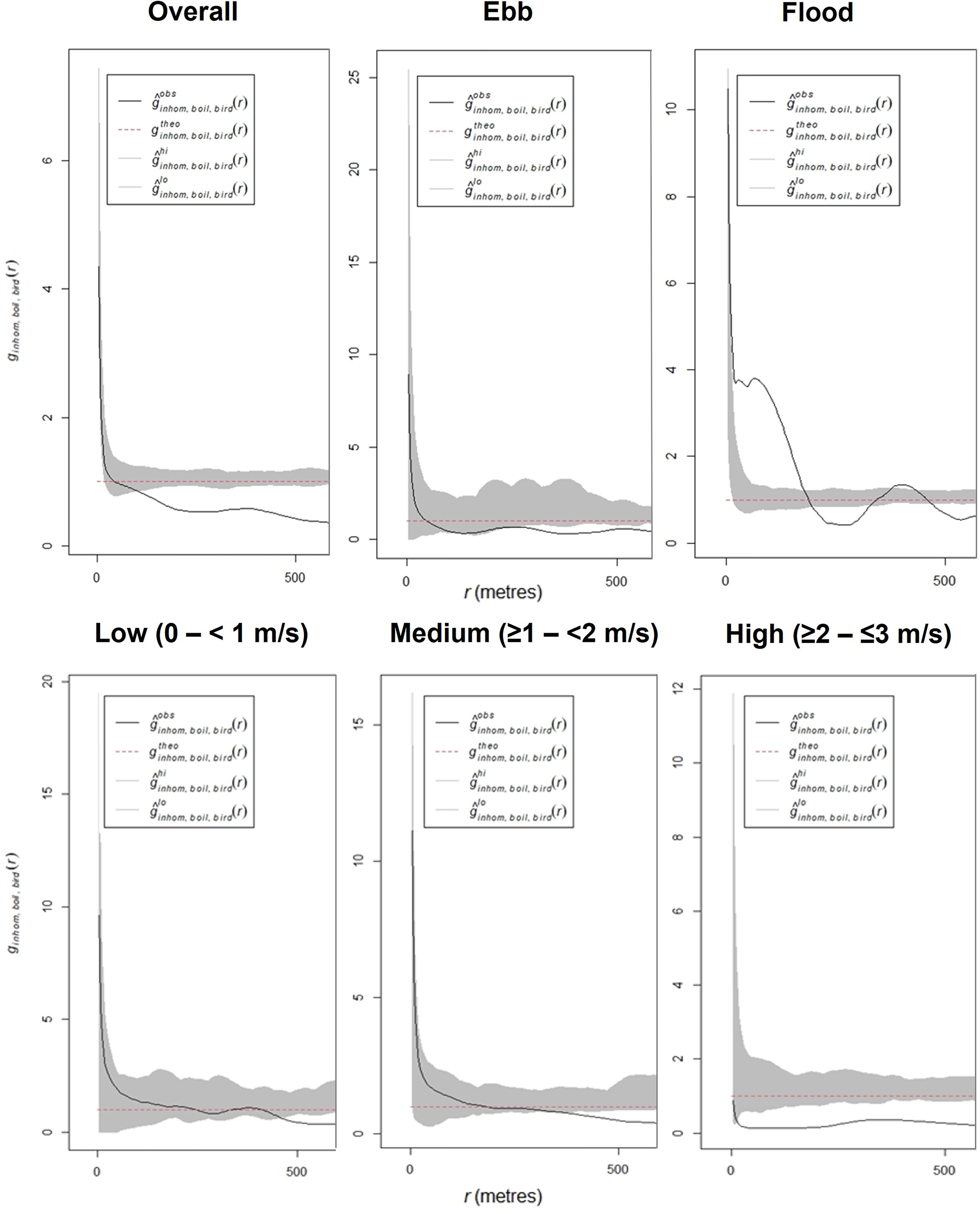 A marked correlation function, which detects correlations amongst categorical marks in PPPs, was used to determine the bandwidth value for analysis and highlight an overall distance at which there is significant correlation (either clustering or dispersion) between points. Beyond this point was deemed to be non-meaningful as it is unlikely that points would influence each other beyond that spatial range. In this case, a significant relationship, of some description, was observable between kolk-boils and auks up to 500 m (Supplementary Figure 2). The focus of kolk-boil and auk interaction was therefore between 0 - 500 m within the following results.