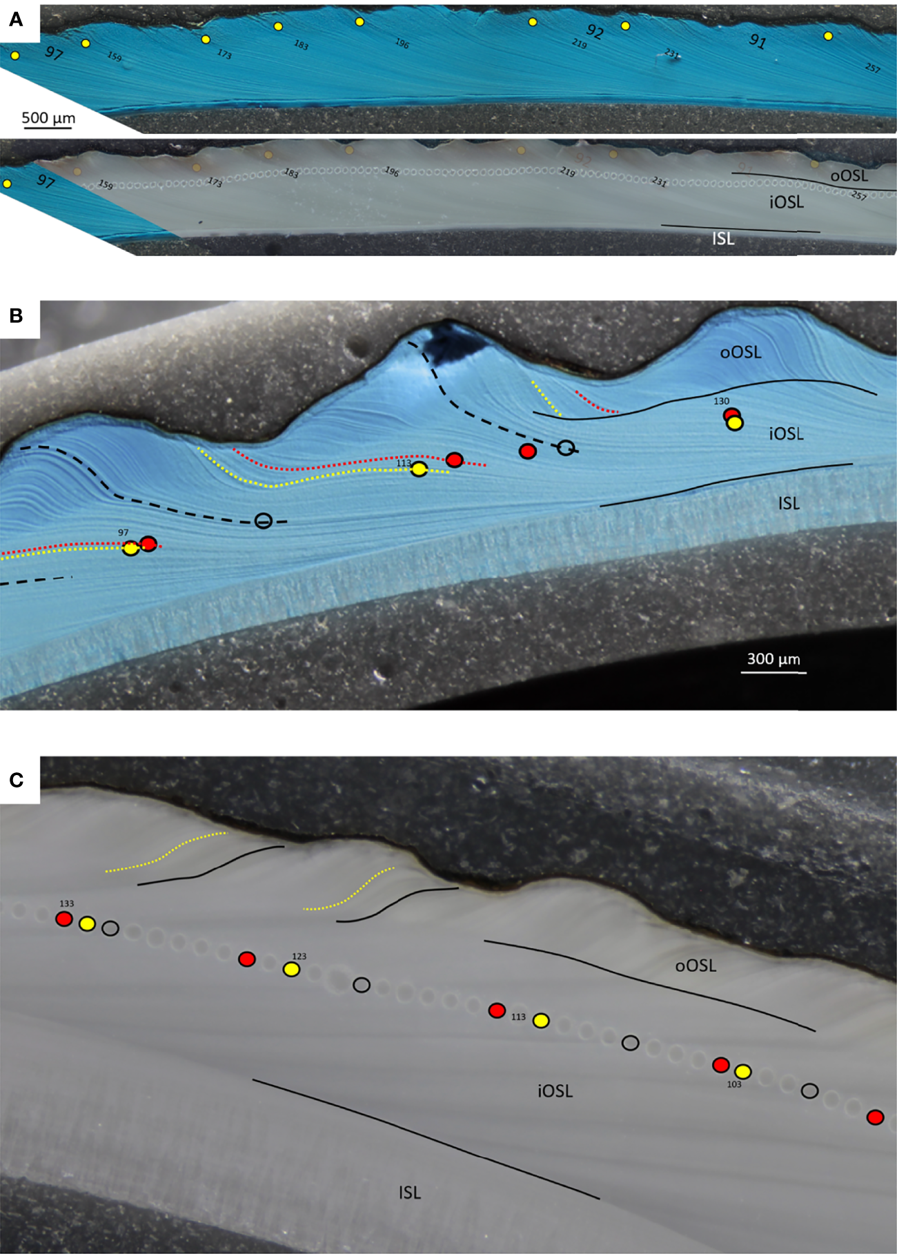 Growth patterns in shells of Arctica islandica (A, specimen MLZ-FBR36-A4L), Astarte elliptica (B, MLZ-FBR36-A9L) and Astarte borealis (C, MLZ-FBR06-A1L). (A, upper panel + B) = sectoral darkfield illumination; (A, lower panel and C) = brightfield illumination (with partly numbered LA-ICP-MS spots). Yellow circles and yellow dotted lines indicate seasonal magnesium peaks, red circles (LA-ICP-MS spots) and lines stand for manganese peaks, and black open circles in Astarte spp. denote Mn minima. Bold numbers in A = calendar years (e.g., “97” = 1997). In A. islandica, only one annual growth line is developed which forms in late fall and is associated with the seasonal Mg peak. In Mutvei-stained sections (A upper panel), the annual growth lines were often difficult distinguish from disturbance lines. In such cases, comparison with polished cross-sections (A lower panel) was a great help, because distinct brown annual bands were occasionally developed with the Mg maxima occurring in their center. In Astarte spp., two annual growth lines can be distinguished which delimit a dark band (dark blue after immersion in Mutvei’s solution, B, and grey in polished sections, C), i.e., a faint, Mg-rich line at the beginning and a distinct Mg-depleted line at the end. The dark band consisted of a series of very narrow intra-annual growth lines indicating slow winter growth. Intra-annual growth lines approached the outer shell surface at an increasingly steep angle toward the end of the growth band. With the beginning of the new growing season (lighter blue or grey in B, C, respectively), the angle became much shallower indicating fast shell growth. Faint black lines were used show the boundary between the different shell layers, i.e., the outer and inner portions of the outer shell layer (oOSL, iOSL) and inner shell layer (ISL). Note that the ISL in A. islandica is almost completely dissolved (A), whereas both astartids show thick inner shell layers. In A. elliptica, the spiral rides of the outer shell sculpture (approx. one per year) are mirrored in the wavy boundary between the two sublayers of the OSL (B), whereas the boundary between the oOSL and iOSL in A. borealis is much less wavy (C).