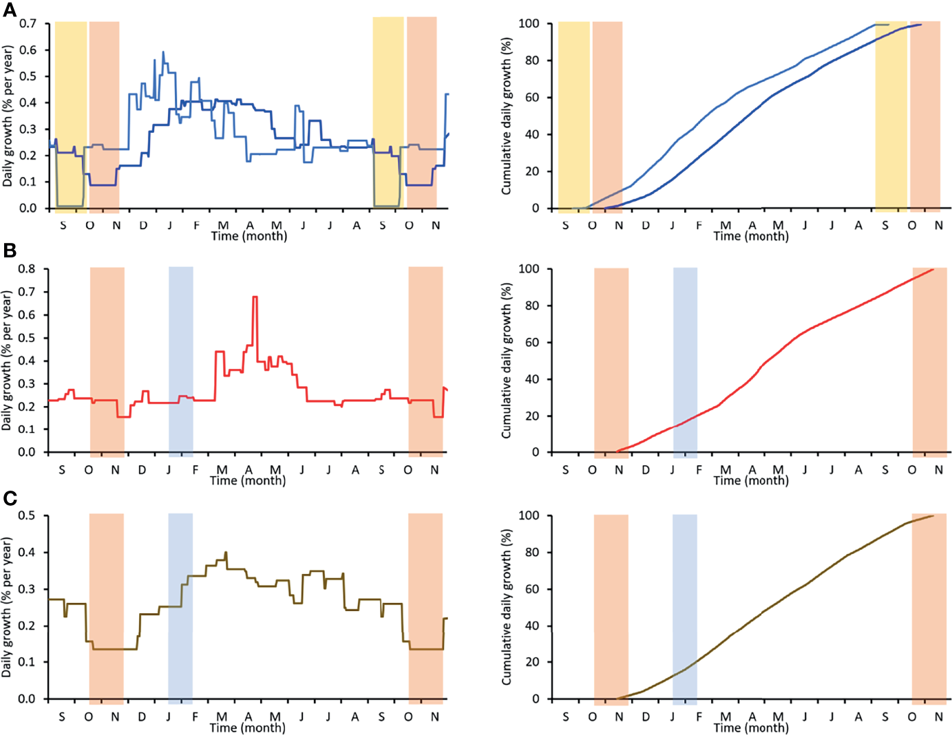 Seasonal growth models of the three studied species based on the oxygen isotope alignment technique. Left panel: daily growth rates, right panel: cumulative growth curves. (A)A. islandica, station FBR36 (Fehmarn Belt) is brilliant blue, St12 (Mecklenburg Bight) in pale blue; (B)A. elliptica, FBR36; (C)A. borealis, FBR06 (Fehmarn Belt). Vertical bars represent annual growth lines. Red, yellow = Mg-rich line at Fehmarn Belt and Mecklenburg Bight, respectively; blue = Mg-depleted growth line. In Astarte spp., the red and blue lines delimit a grey (or Mutvei blue-stained) growth band. Data from Mecklenburg Bight taken from Schöne et al. (2021).