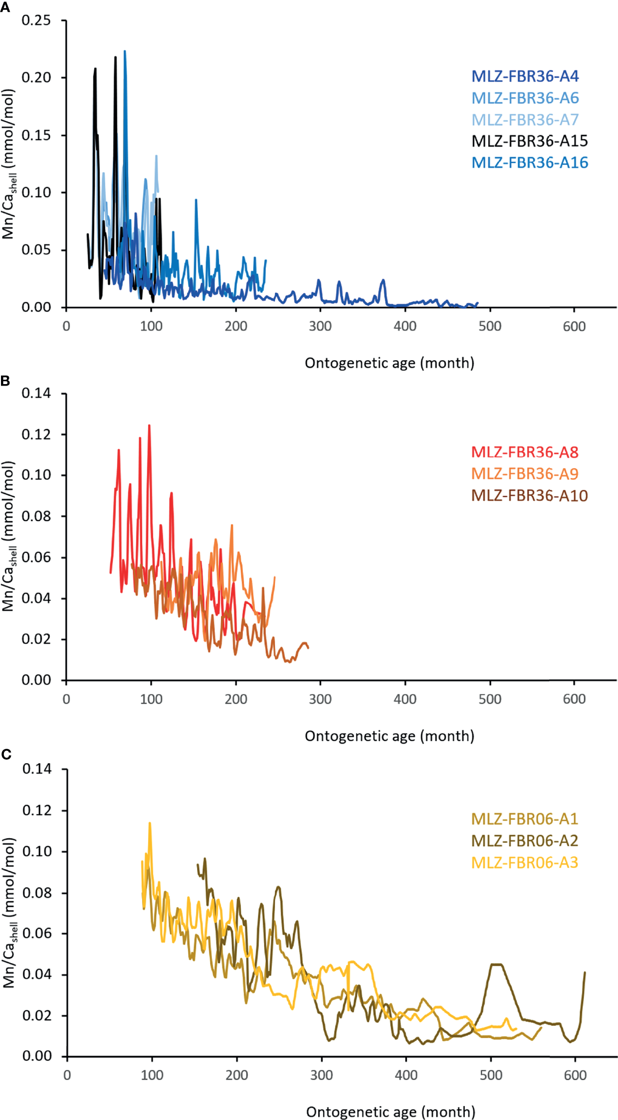 Mn/Cashell chronologies (monthly resolution) reveal striking ontogenetic trends to lower values. (A)A. islandica; (B)A. elliptica; (C)A. borealis.