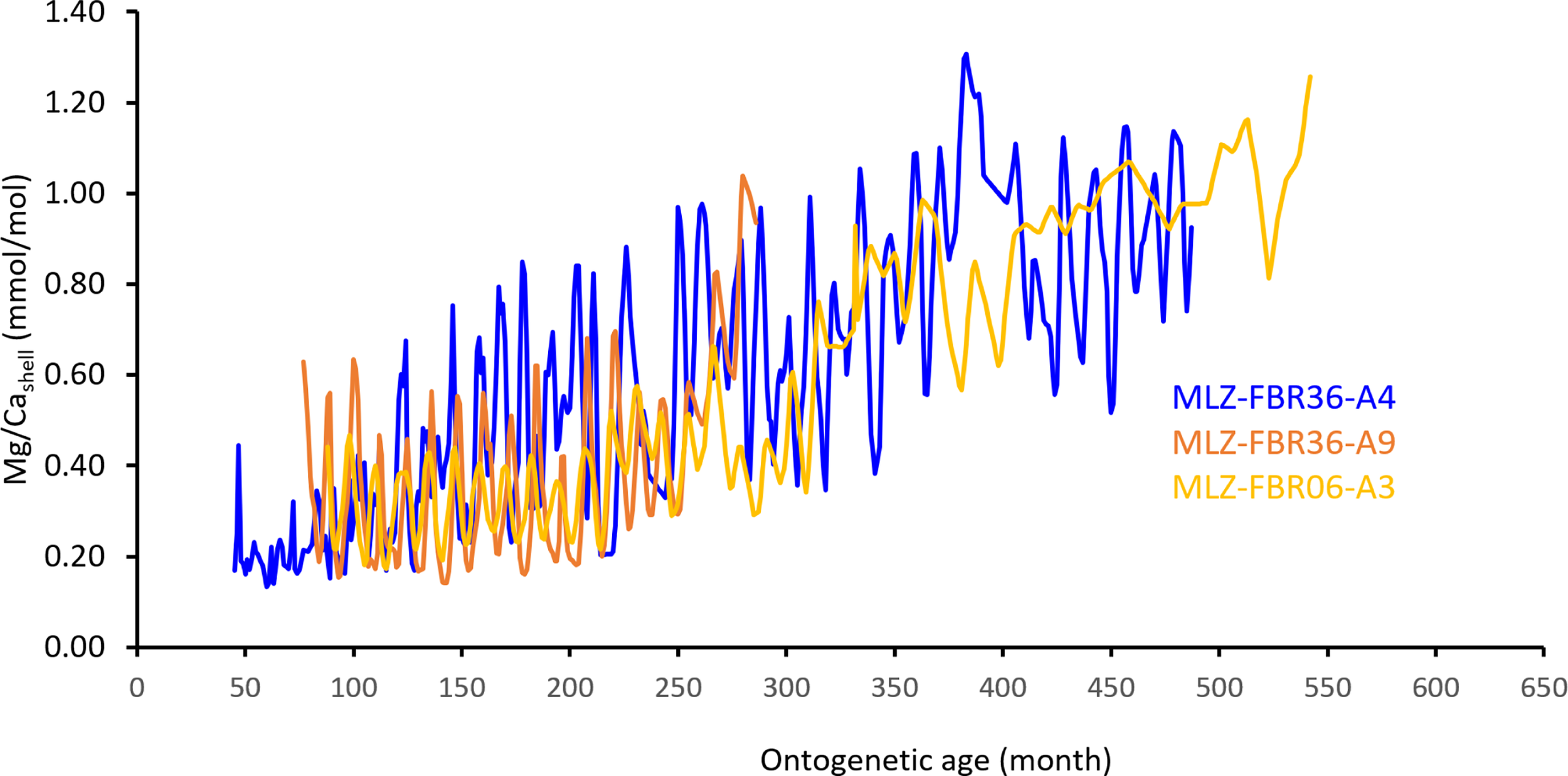 Mg/Cashell chronologies (monthly resolution) of long-lived specimens of A. islandica (MLZ-FBR36-A4), A. elliptica (MLZ-FBR36-A9) and A. borealis (MLZ-FBR06-A3) reveal distinct seasonal oscillations and a gradual increase through lifetime.