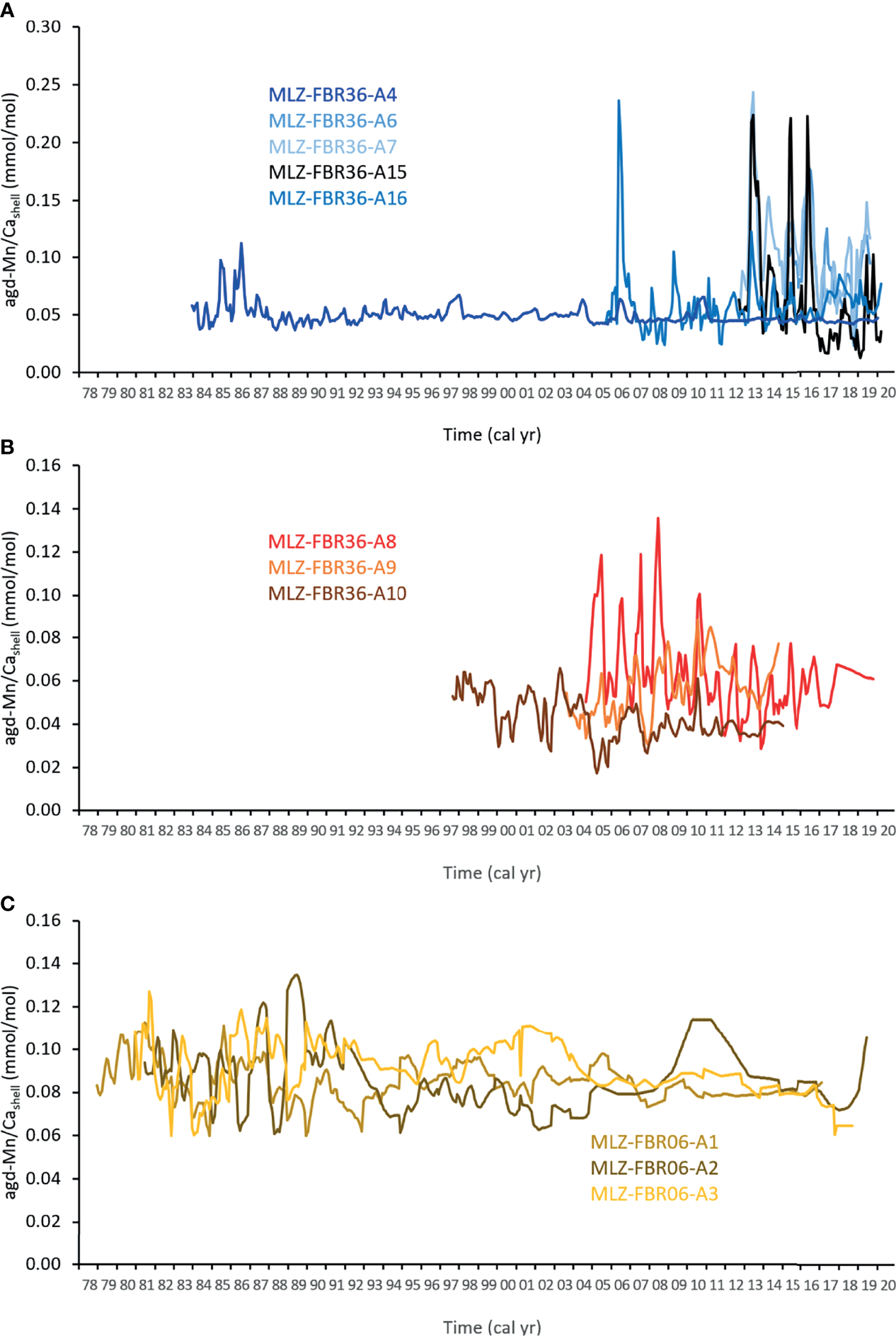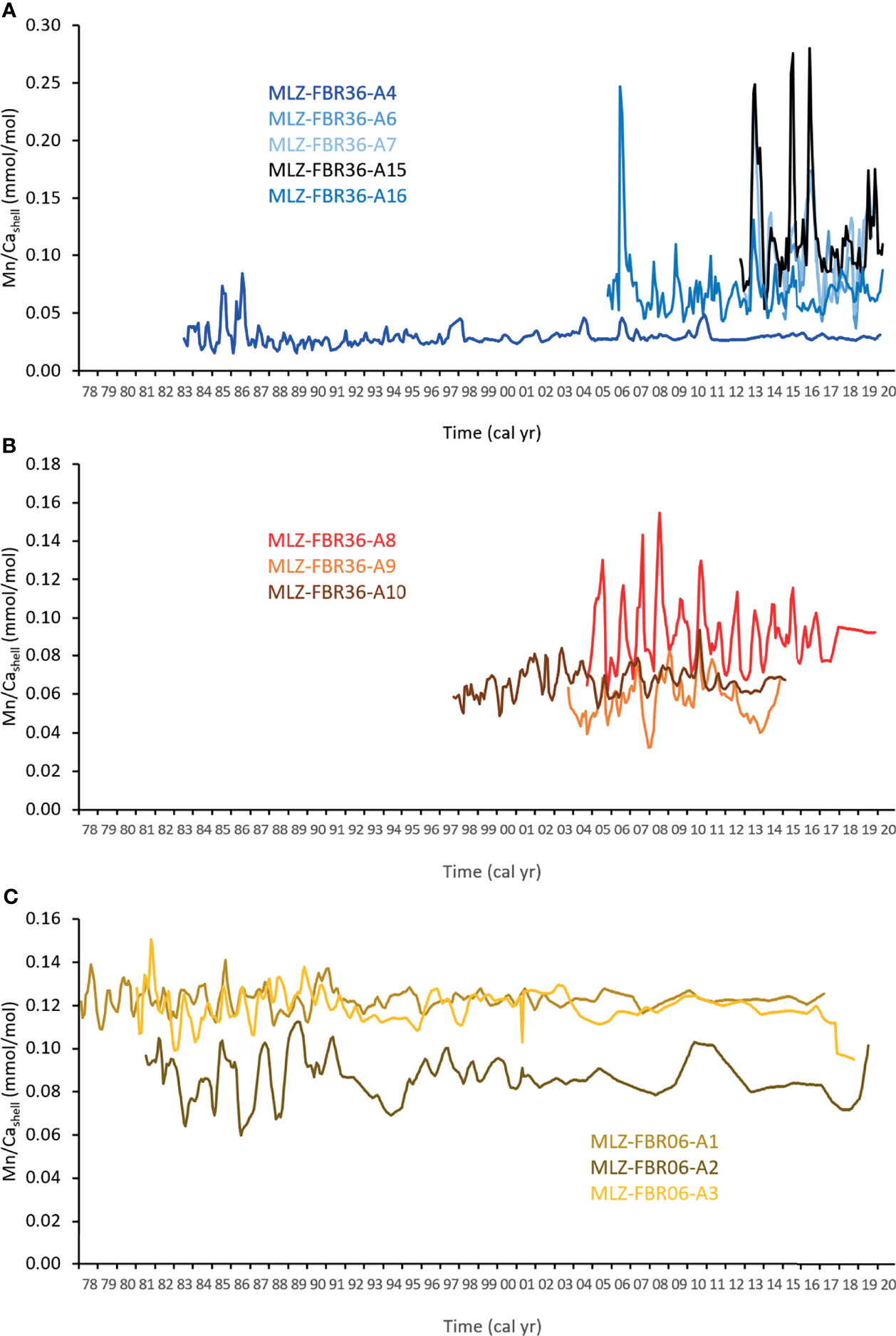 When this ontogenetic age-related trend was mathematically removed (and the data plotted against calendar year), the detrended Mn/Cashell curves not only revealed significant differences in level and seasonal variance between conspecific specimens as well as between species, but also some degree of running similarity (Figure 7). For example, in the 2010s, A. islandica specimen A4 barely exceeded 29 µmol/mol, whereas specimen A16 fluctuated between 43 and 131 µmol/mol (Figure 7A). The three remaining specimens from Fehmarn Belt were in closer agreement with each other and ranged between 37 and 280 µmol/mol (Figure 7A). Similar discrepancies in level were observed in the two Astarte species (Figures 7B, C). A. elliptica specimens A9 and A10 were in close agreement, specifically during 2004 and 2011, while specimen A8 showed, on average, approx. 20 µmol/mol higher values than the other two individuals and more than two to three times larger seasonal amplitudes (Figure 7B). In some years (mid 1990s), monthly Mn/Cashell values of different A. borealis specimens deviated by nearly 750% (40 µmol/mol), while specimens MLZ-FBR06-A1 and A3 were much closer together (Figure 7C).