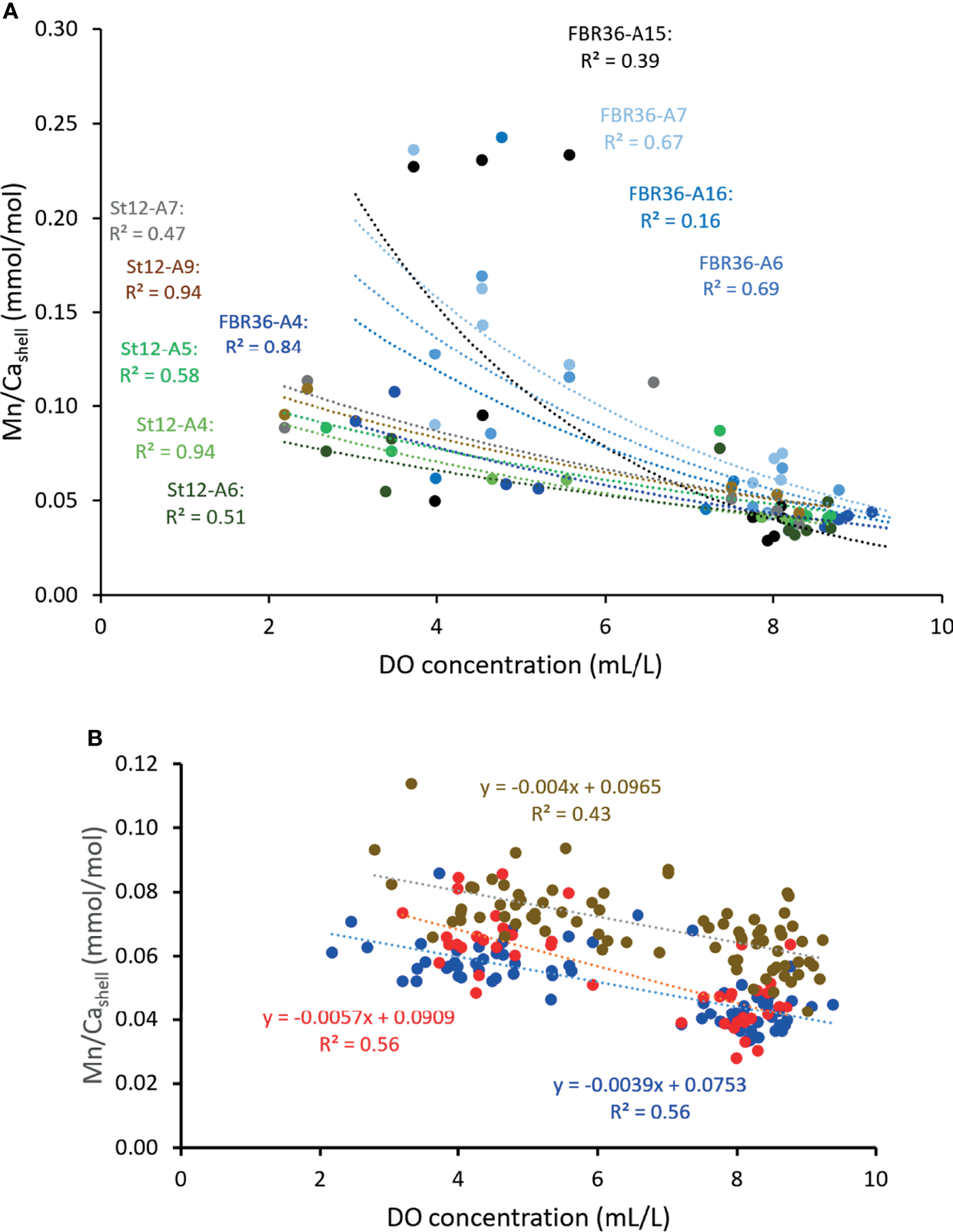 (A) During early ontogeny (below age 10), Mn/Cashell revealed non-linear relationships (here exponential fits used), even after double-detrending (= correlation between Mn/Cashell with both annual growth rate and Mg/Cashell mathematically eliminated). Significance levels were determined on the basis of linear regression models. Accordingly, except for specimens FBR36-A16 and St12-A7, all correlations were highly significant at p < 0.05. Trends varied between specimens, not localities. St12 = Mecklenburg Bight, FBR36 = Fehmarn Belt. (B) If the data from shell portions formed prior to age 10 were omitted, the relationship between Mn/Cashell of A. islandica and DO concentration measured some decimeters above seafloor became much stronger. All correlations were highly significant at p < 0.0001. (Compare Figure 10C).