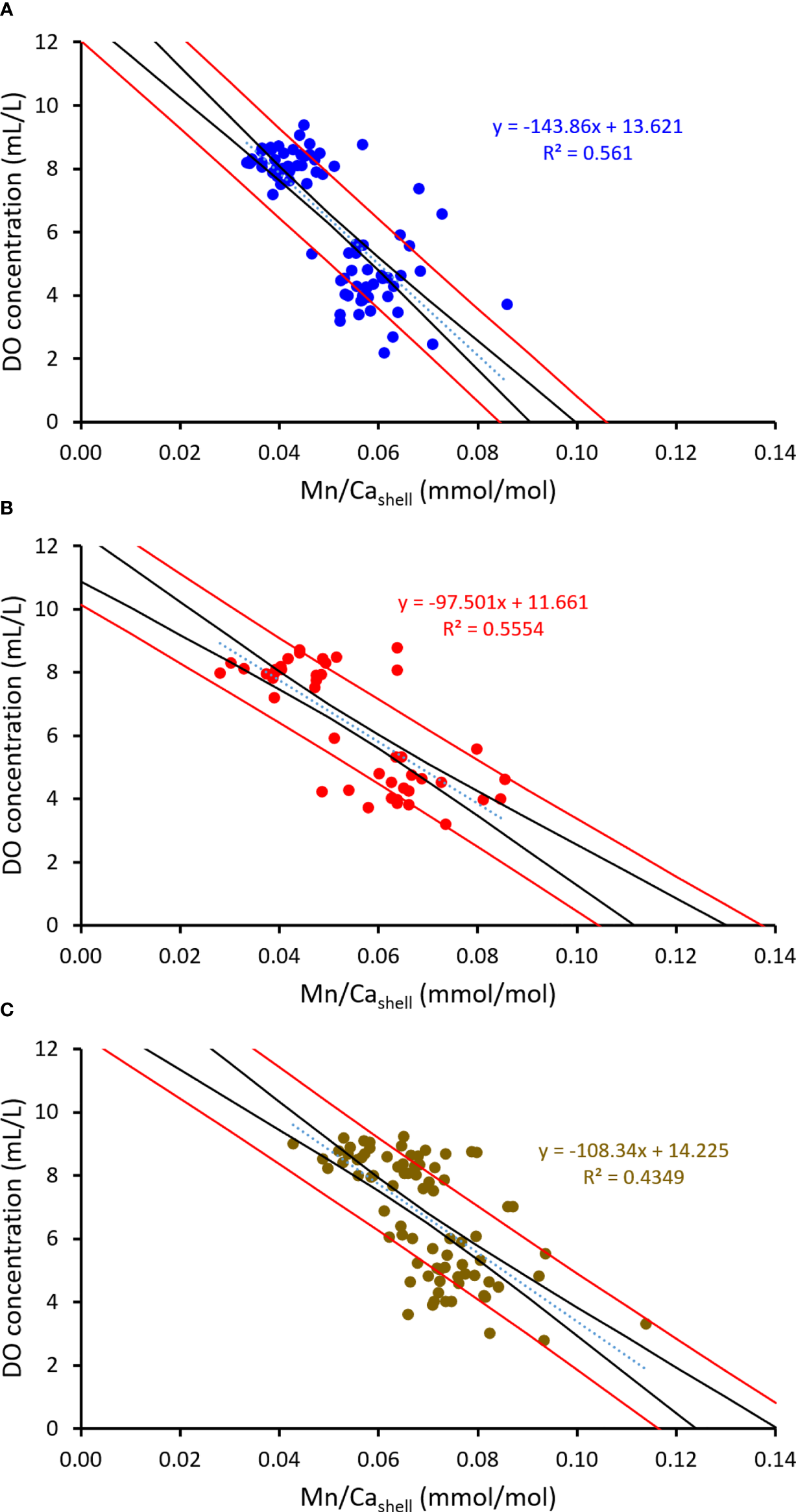 Tentative linear models to predict DO concentration some decimeters above seafloor using Mn/Cashell values of the three studied bivalve species (N = 79 (A), 44 (B) and 80 (C); all p < 0.0001). (A)A. islandica; (B)A. elliptica; (C)A. borealis. Black curves = 95% confidence intervals of the regression lines; red curves = 1σ prediction intervals. A. elliptica can provide slightly more precise DO data ( ± 1.5 mL/L) than A. islandica or A. borealis ( ± 1.6 mL/L).