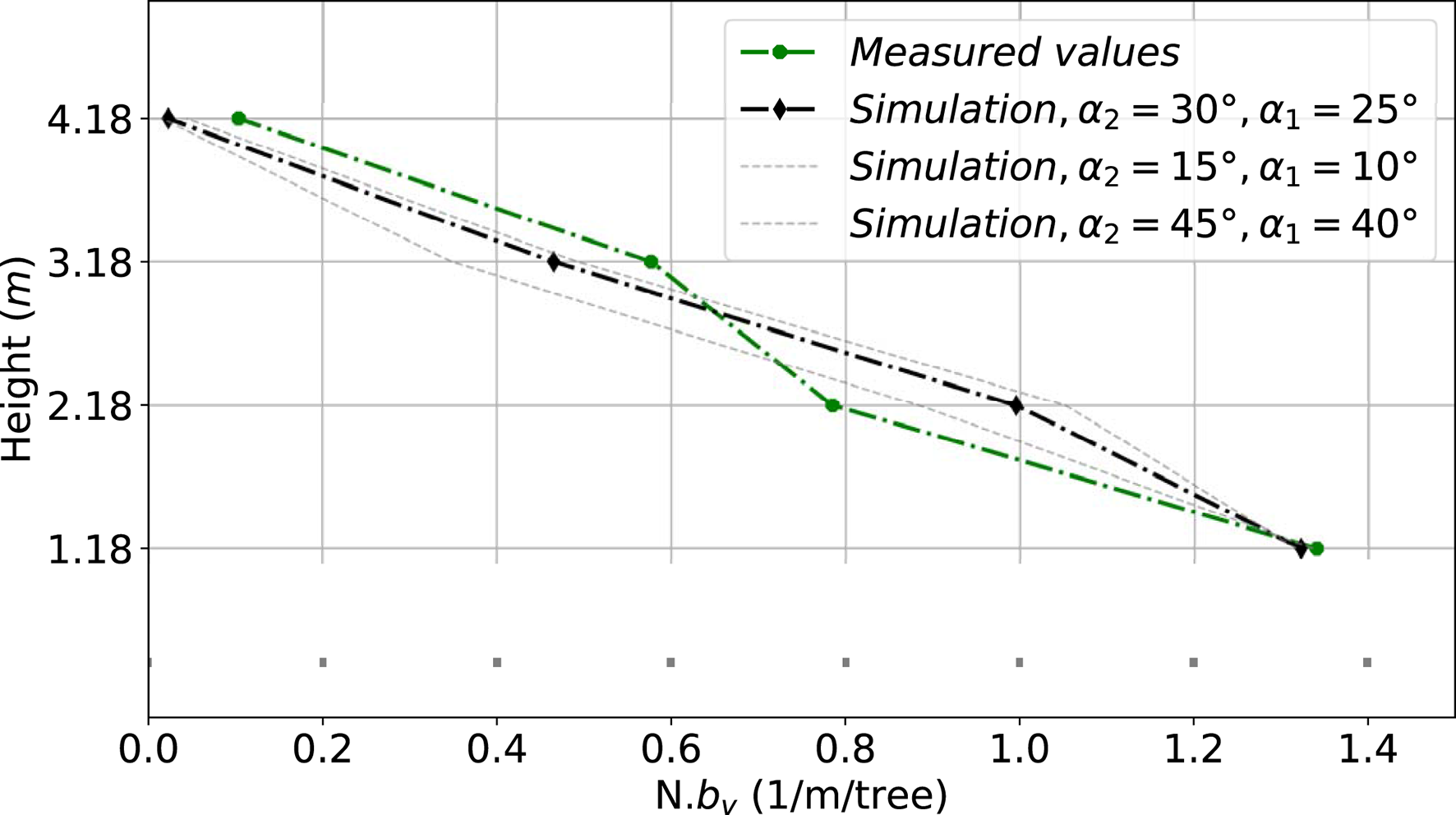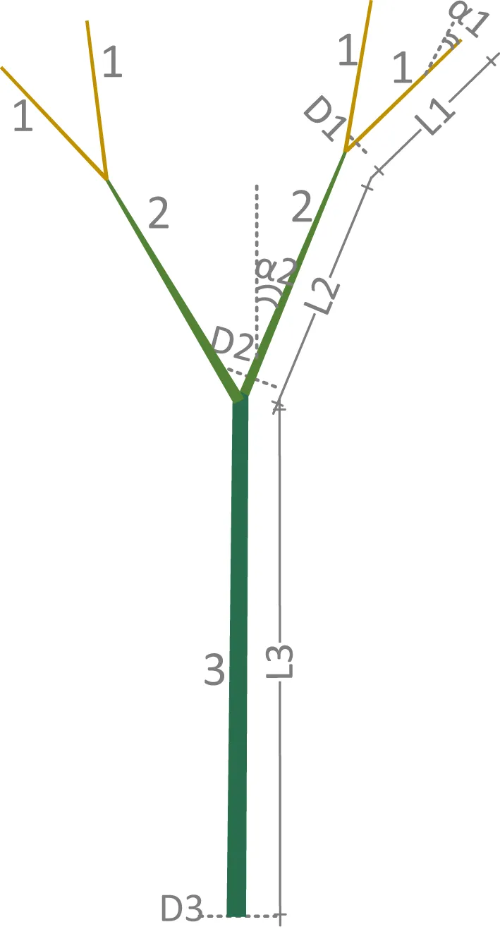 Secondly, we used the detailed sketches of the branches to obtain three branching factors. These branching factors show the number of side branches that a mother branch can support (RB), the diameter ratio (RD) and length ratios (RL) between subsequent branch orders. These factors are defined as follows: RB = , RD = , and RL = ; where m is the child branch, (m+1) is the mother branch, Nb is the number of side branches, D is the diameter, and L is the length of the branch. The obtained branching factors differ per order (Table 2), thus we maintained distinct values per order instead of working with the average values and are assumed constant for all trees.