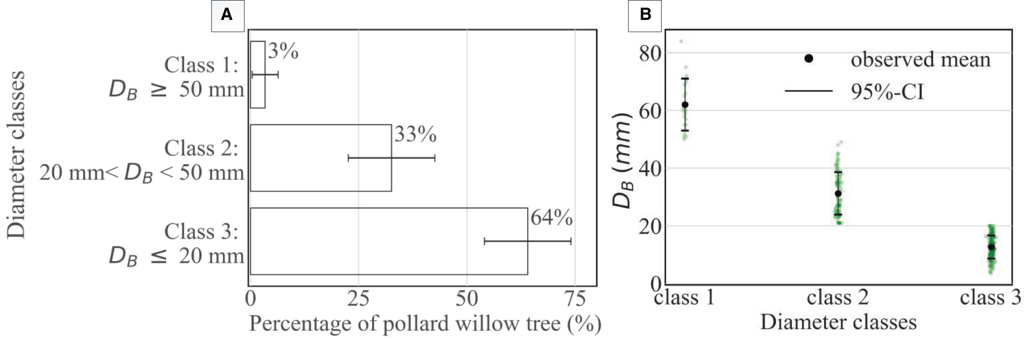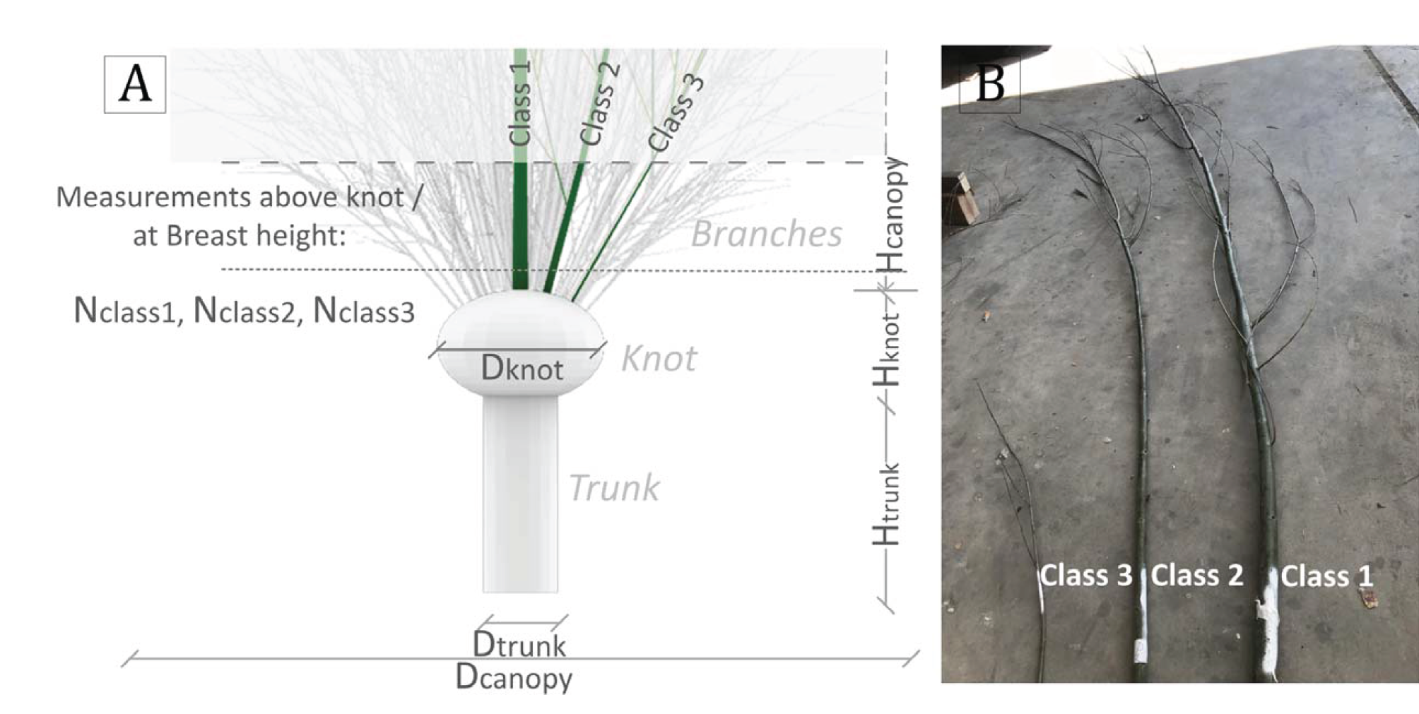 (A) General tree characteristics of the pollard willow, (B) examples of the 3 different diameter classes of branches.