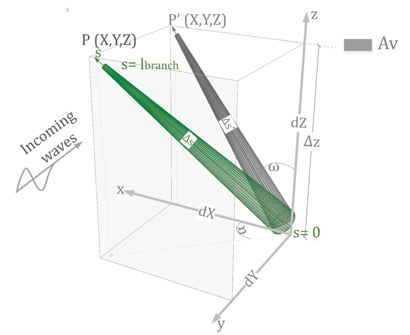 where FD is the drag force and Fi is the inertia force. The Morison equation is solely suitable for determining the drag forces on slender objects (neglecting diffraction of waves around the object). We can still use this equation for predicting drag forces on trees with low canopy densities (i.e., no porosity effects namely effects of blockage and sheltering) (Etminan et al., 2019), and the ratio between the wave length and the diameter of the individual branches is small. Furthermore, most of the studies assume linear wave theory to be valid within vegetation fields; therefore, the total force on the vegetation is solely due to the drag forces as the inertia forces are out of phase with the velocity signal. Dalrymple et al. (1984) found an analytical solution for the wave height evolution through a vegetation field. His study focused on vegetation on a flat bottom subject to regular waves. This application has been extended by Mendez and Losada (2004), accounting for sloping bottom and irregular waves. The wave height decay through a vegetation field can be determined with the following equation (Mendez and Losada, 2004):