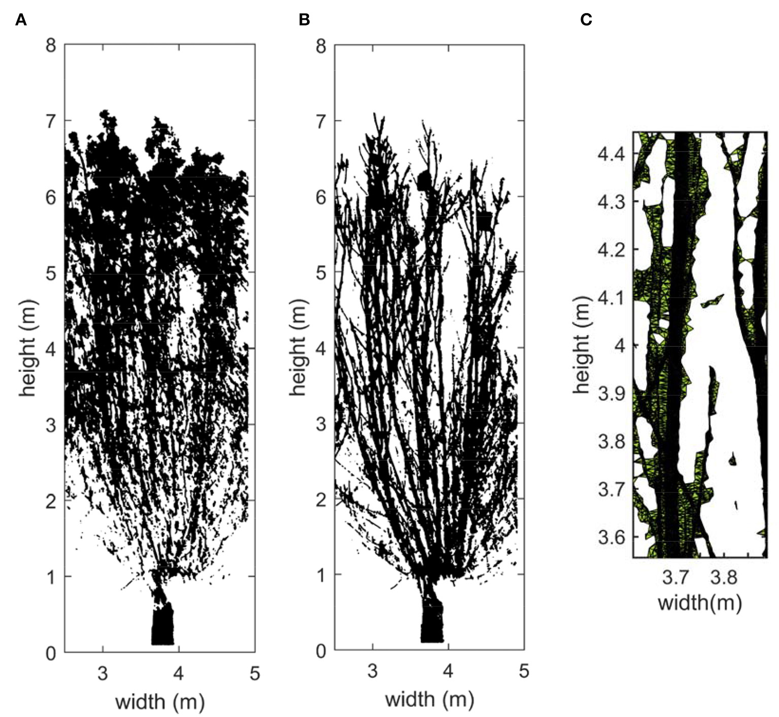 Lastly, remote sensing techniques can be used to obtain vegetation parameters. Space-borne and airborne methods are effective for very large-scale measurements, for example identifying the state of the vegetation, but are less accurate for capturing vegetation parameters such as height and canopy structures (Srinivasan et al., 2014). On a smaller scale, optical techniques are commonly used, and provide detailed information on the geometry (e.g., Norris et al., 2017; Maza et al., 2019). This method becomes more difficult and less accurate when dealing with larger objects, such as trees. For tree and forest scale applications, Terrestrial laser scanning (TLS) shows to be a good alternative. A comparison between TLS results and the branching method of Jarvela showed a good agreement in terms of total area of trees, which was afterwards used for determining the flow resistance during floods (Antonarakis et al., 2009).