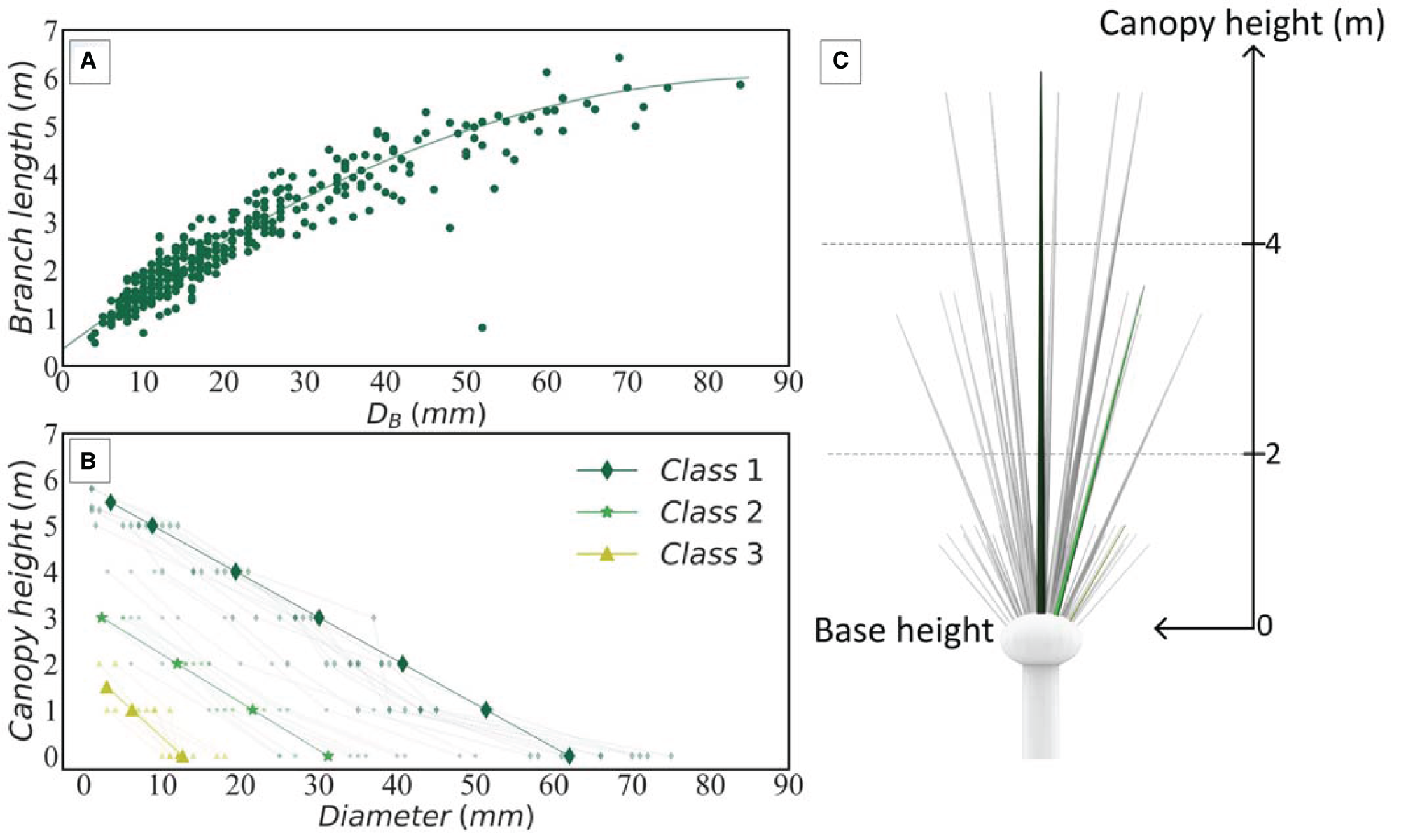 The first method considers the primary branches (i.e., main shoots) and their tapering form. Information of the branching structure and side branches is not included, therewith the contribution of the side branches (secondary and tertiary) to the total Av is neglected. Allometric relations between DB and the total length of the branches (Section 3.1.1), the total number of branches counted per tree, together with diameter decay relations of the primary branches were used to predict diameter and the total number of branches at vertical increments of 1 m. With this, the frontal-surface area is obtained at vertical increments of one meter for each tree. Hereby it is assumed that the primary branches are oriented perpendicular to the knot, with the largest branches located in the center of the knot (see Supplementary Figure S1).