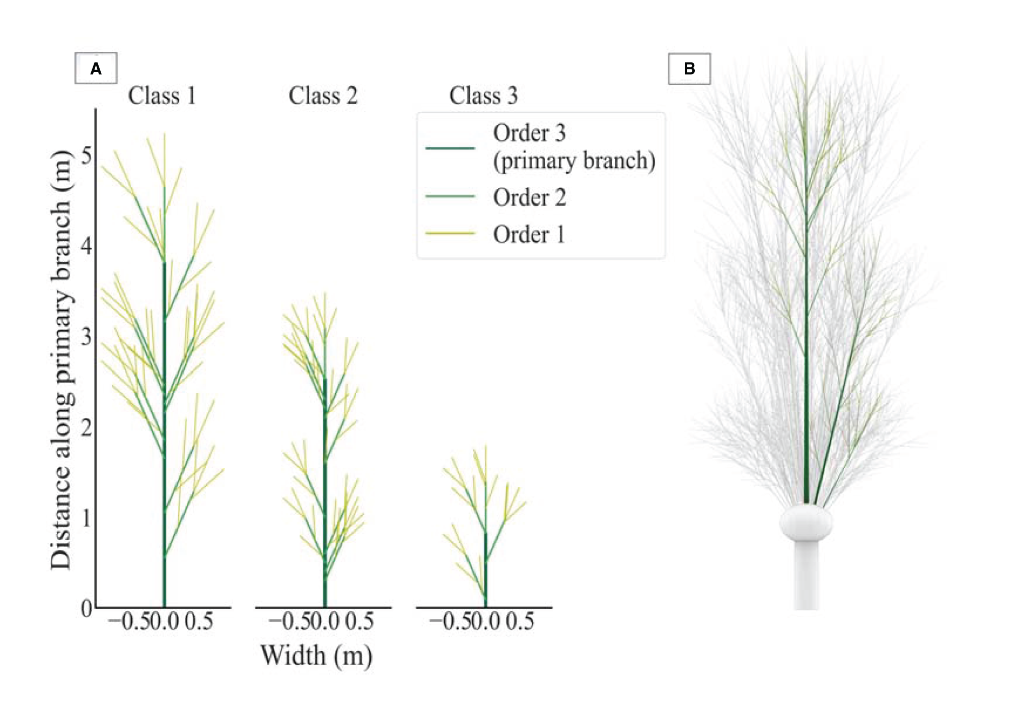 The pollard willow trees (Salix Alba) were 15 years old with 3-year-old primary branches (i.e., branches that directly sprout from the knot of the tree). These primary branches were categorized into 3 classes (see Figure 2) based on the diameter at their base, DB (i.e., diameter at the location above the knot), namely: class 1 (DB > 50 mm), class 2 (20 < DB ≤ 50 mm) and class 3 (DB ≤ 20 mm).